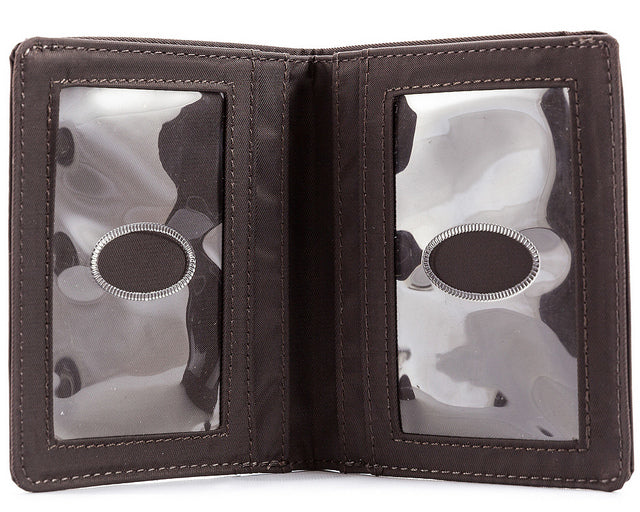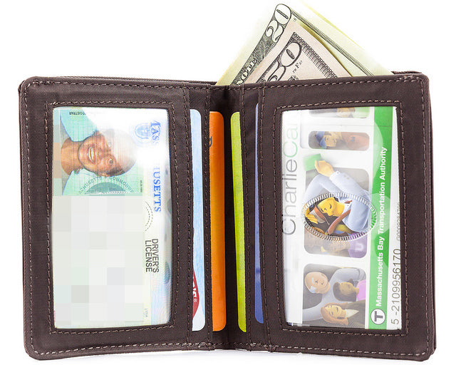 Double clear-ID pockets and parallel card storage pockets behind--perfectly compact for the city dweller with multiple id and transportation cards. And a billfold area that many use as more card storage. You can't ask for a thinner metro bi-fold wallet or we would have to make it out of paper. Easy to open and flash that ID badge or pull out the metro card because let's face it, we're running late. This metro bi-fold wallet holds about 18-20 thick plastic cards and cash, very compactly.
