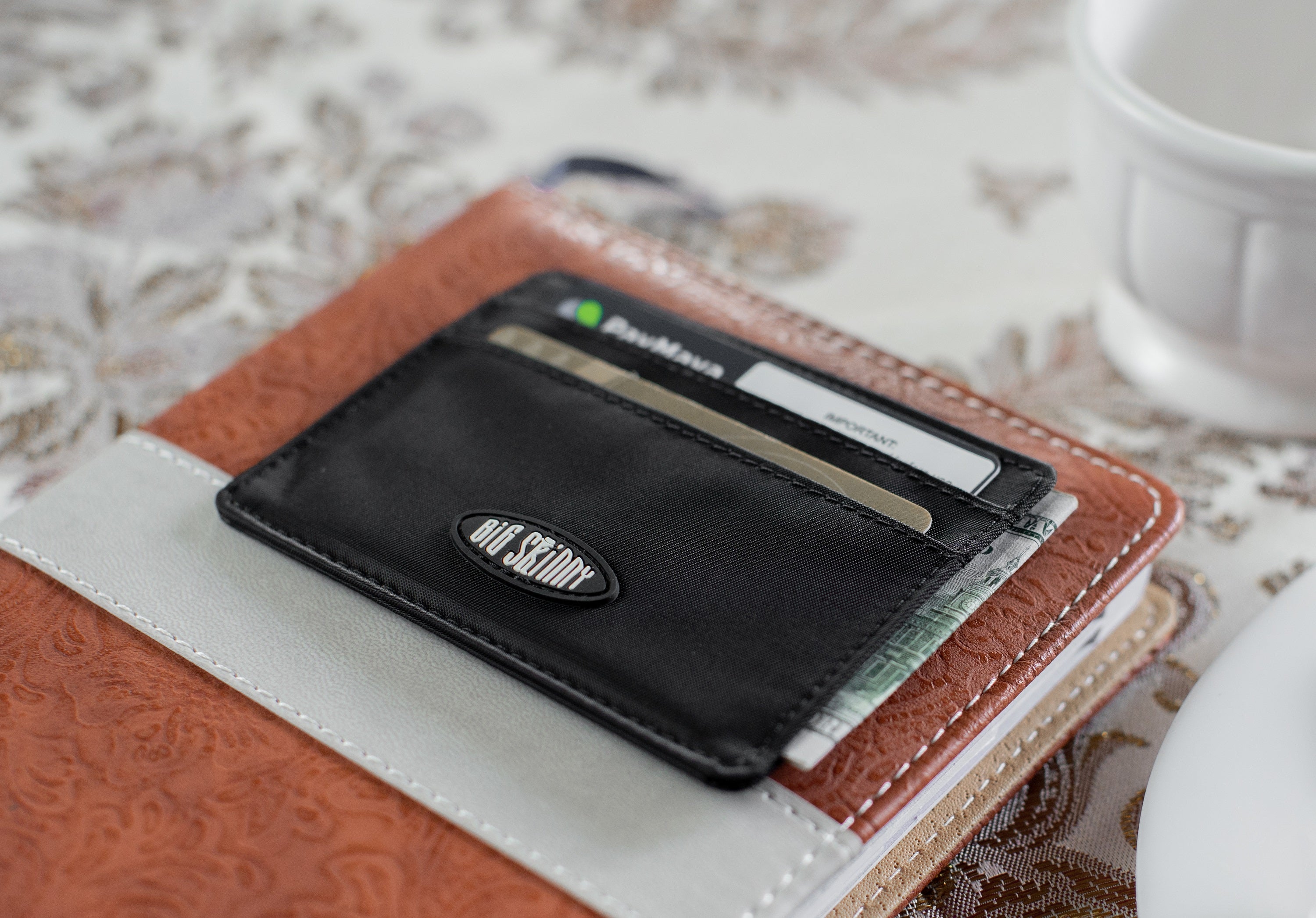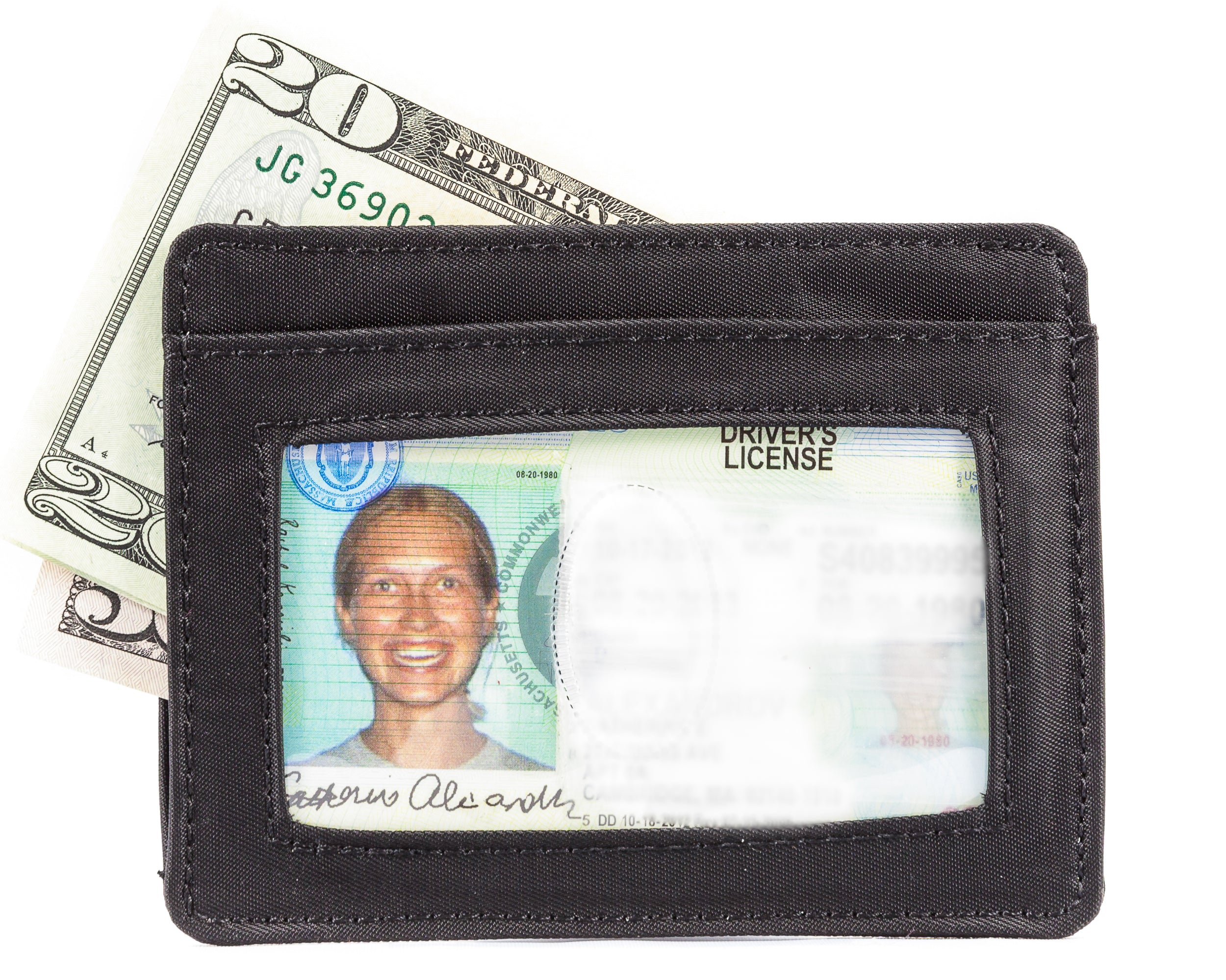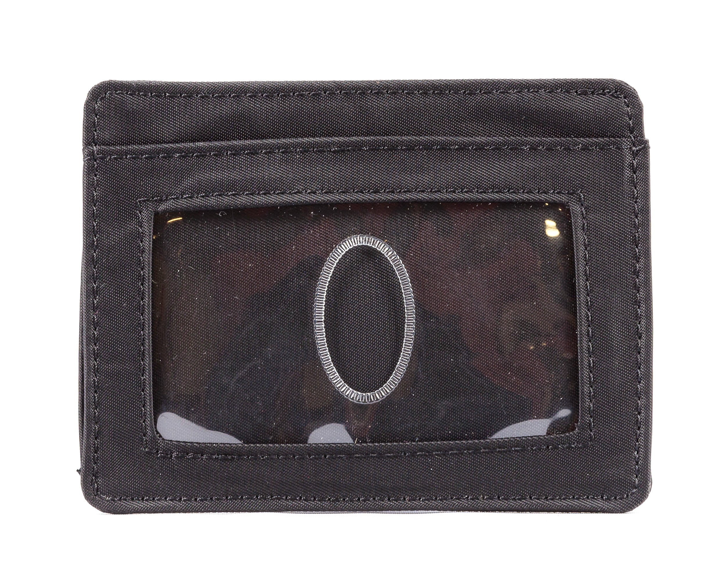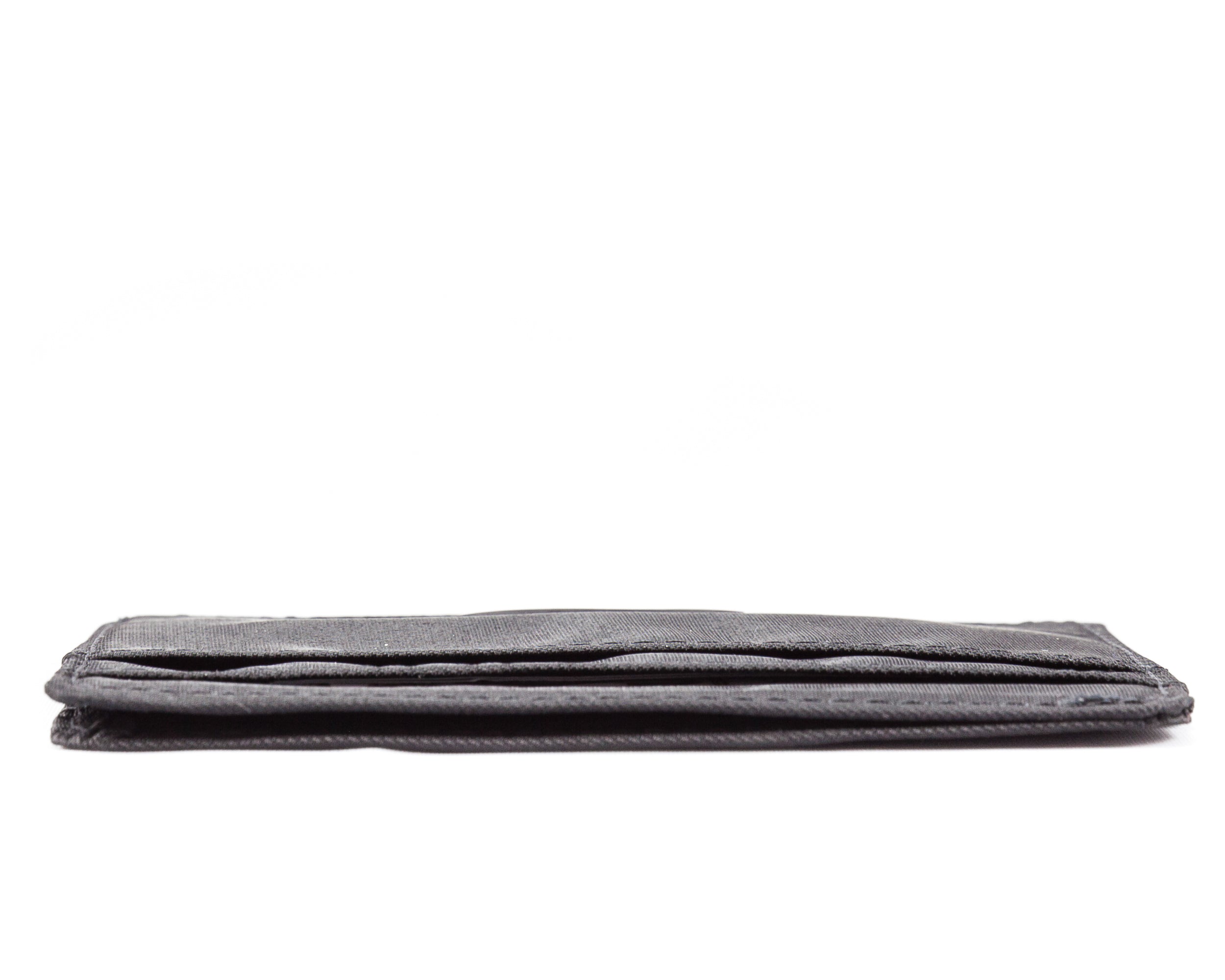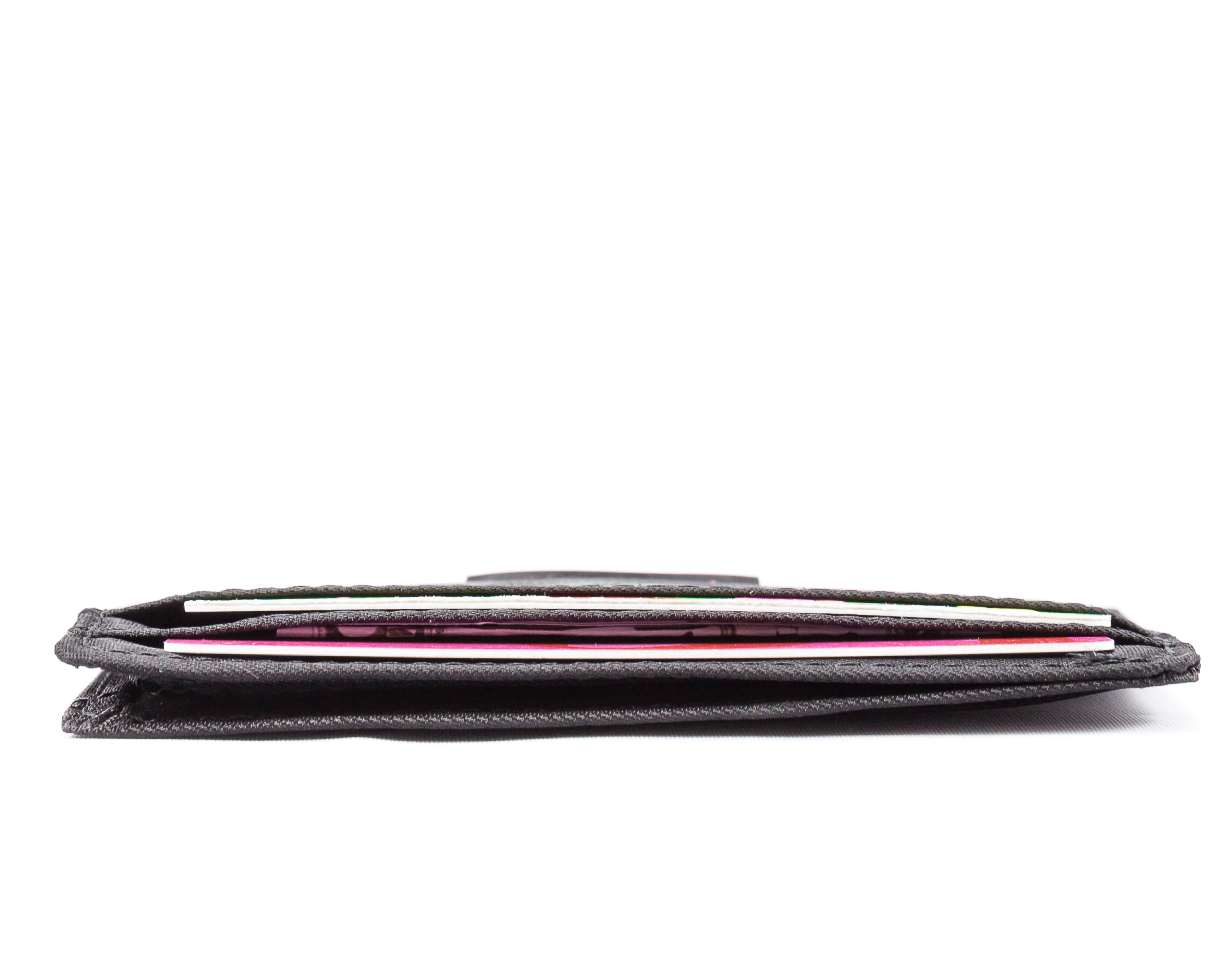 Instead of just having on opening from the top like our other mini skinny card cases, you can now slide cards and cash into the middle compartment through the open side as well. A divider was added in the middle compartment so you can separate your goods. Two pockets on the front accommodate three plastic cards each and the clear ID pocket on the reverse accommodates about three plastic cards also. In total, this card case/money holder can carry about 12 plastic cards because you can also put extra plastic cards in the middle along with your cash money. It's like having a screen porch door on your card case, easy to peek into and open and close and with plenty of fresh air so your money stays green. But don't worry, even with that new side opening--you still have our special rubbery coating on the reverse of our material that keeps your goods safe from gravity.