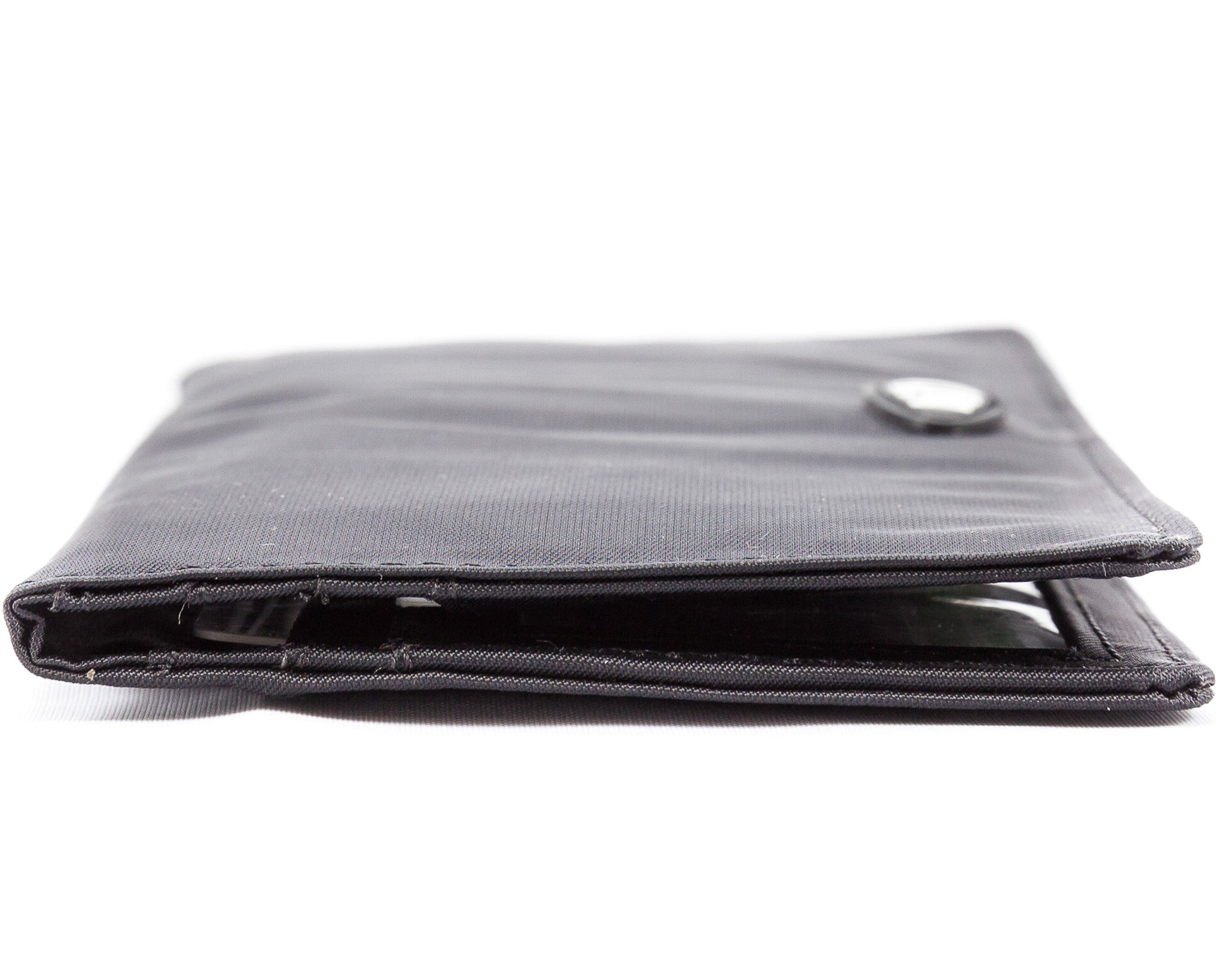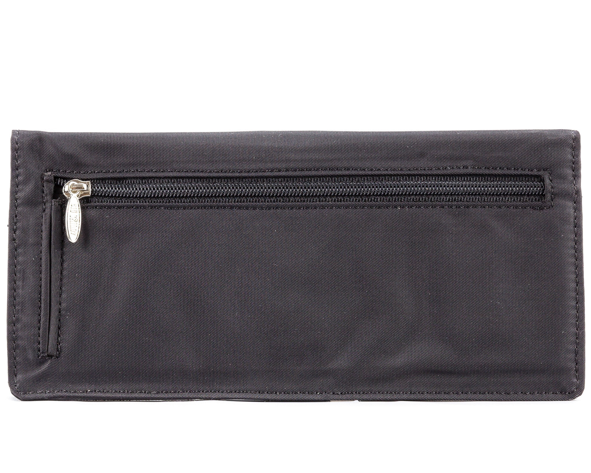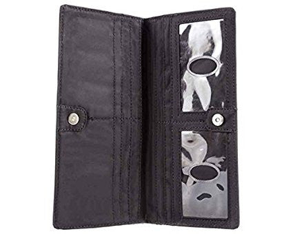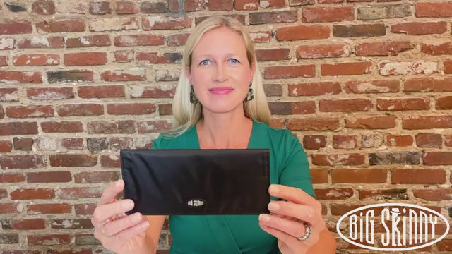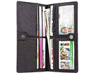 This is the pencil skirt or pin-striped suit of our wallets…that impeccably tailored, polished look. This wallet will make people assume you read the WSJ while running your daily 10K before arriving at work at 6 am. Sleek, long, thin wallet yet roomy enough to accommodate up to 40 cards, and stretched out cash money plus coins. Our special “divide & conquer” design breaks up your cards into 4 discrete areas so they don’t all stagger on one long row leaving huge lumps. This means there will be very nice symmetry when your cards are in place and the wallet is shut so you’ll have an even, flattish plane rather than “staggered bulges” like all those other out-dated thick regular wallets. Two discrete billfold sized compartments enable separation between cash, receipts,or even differing currencies for travelers. Two ID pockets allow for double identities or that special photo. Both ID pockets feature our easy access thumb-activated hole for quick and easy card in and out. Snap securely shuts, and features an extra long coin compartment on the outside for easy access. Unisex, and sleek enough for men’s or women’s jacket pockets, briefcases, laptop bags or switching to and from purses. Magnetic snap for an elegant opening and closing wallet experience.