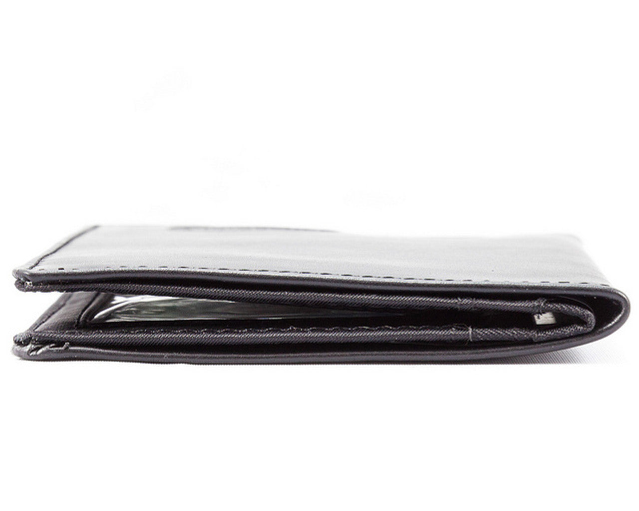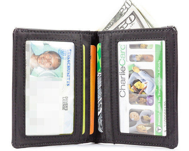 Twin clear-ID pockets and parallel vertical card pockets behind-- compact and convenient for the urban dweller with multiple id and transportation cards. You - our customers - asked for a wallet that was JUST the length of the dollar, and this is it... Or you can keep extra cards in this section and receipts. You can't ask for a thinner metro bi-fold wallet or we would have to make it out of paper. This metro bi-fold wallet holds about 18-20 thick plastic cards and cash. It's basically the next step up from the New Yorker card holder. This model is part of our LEATHER HYBRID collection featuring top-grain, cowhide leather on the exterior and ultra-thin, nylon microfiber on the interior. Features: