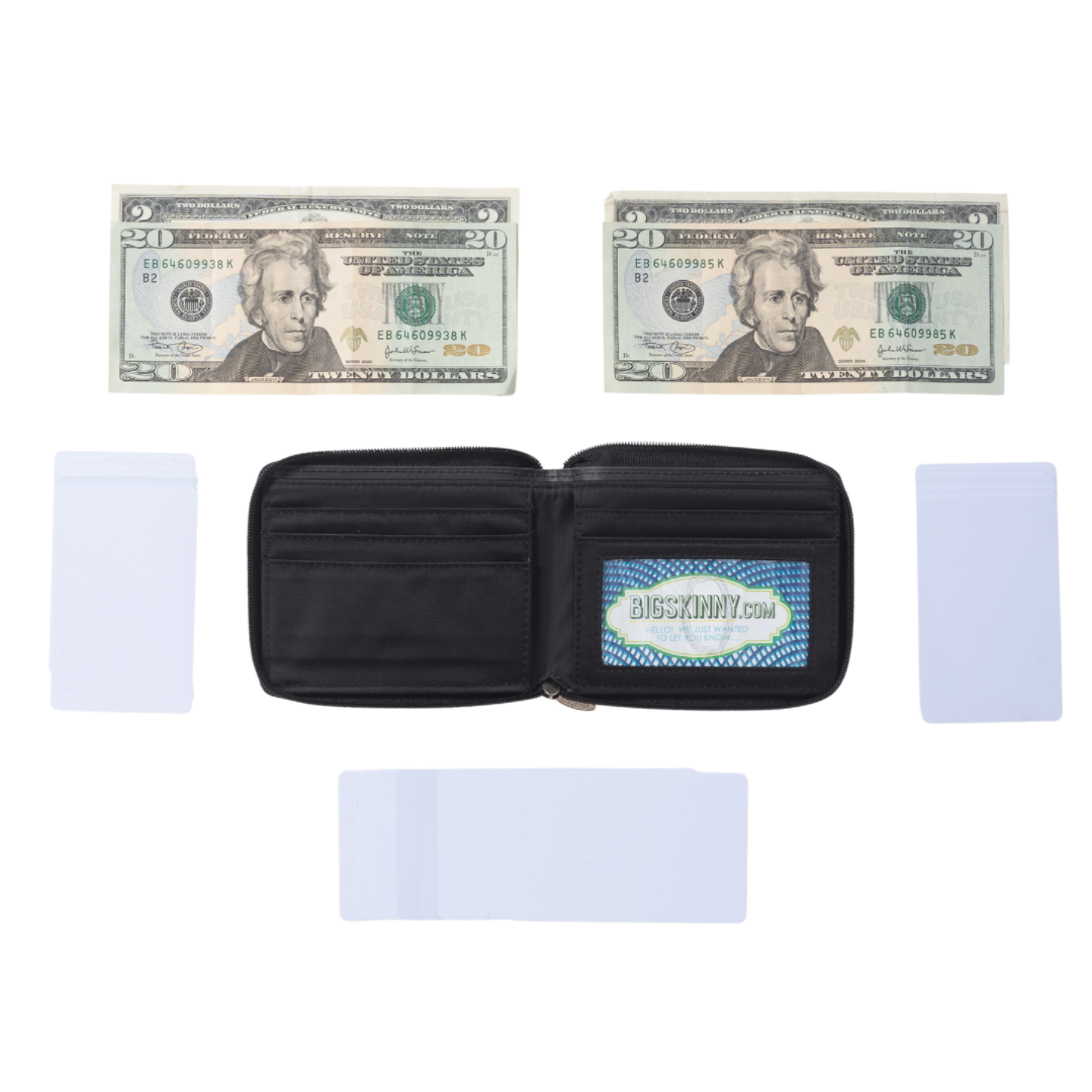 We've taken our Multi-pocket Bifold and added a zipper around the perimeter to keep it securely closed in your pocket or bag. The Bill fold area has a divider to separate your cash from your receipts. Capacity is up to 20 plastic cards. So, here's the Best of Both Worlds: super-thin top-grain leather on the outside and ultra-thin nylon microfiber on the inside.