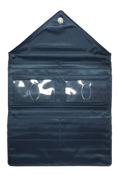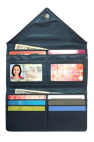 What women love are the surplus of non-slip pockets inside this stylish tri-fold wallet that's fashionable enough to do double duty as an evening clutch. A magnetic snap closure is on the front of the envelope-style wallet. Inside our tri-fold Slimvelope are two checkbook-sized billfolds, two clear plastic ID card pockets, and eight extra wide card pockets. Each holds up to 3-5 cards.