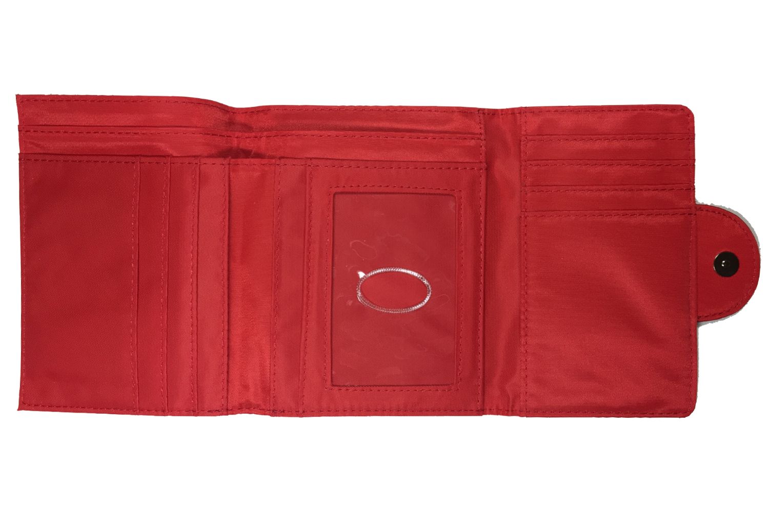 The zippered compartment on the back of this tri-fold wallet is roomy enough for a large handful of change, and the small magnetic closure keeps the whole wallet securely shut when it's being jostled around in your bag.