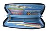 Our Panther clutch has two general billfold/checkbook areas, two extra-wide gusseted storage areas for your essentials, six extra-wide credit card pockets and two extra-wide clear ID pockets. The detachable strap is 9 1/4 inches long. Our gorgeous Panther purse/wallet measures 7 1/2 inches wide and 4 1/2 inches tall. Add this to your suitcase, and you'll have room to pack more shoes.
