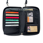 The deep interior divided billfold can hold any type of currency [dollars, euros, etc]. Two vertical pockets can accommodate up to 4 passports [2 in each pocket] or a small notebook. Six extra-wide credit card pockets can hold 2-3 plastic cards each. Two clear ID pockets can hold 2-3 plastic cards, convenient for your driver's license and another photo ID. The perimeter zipper allows you to securely close the entire wallet and be confident as you're walking around that nothing will fall out. The long, adjustable, detachable strap is made from lightweight nylon microfiber.
