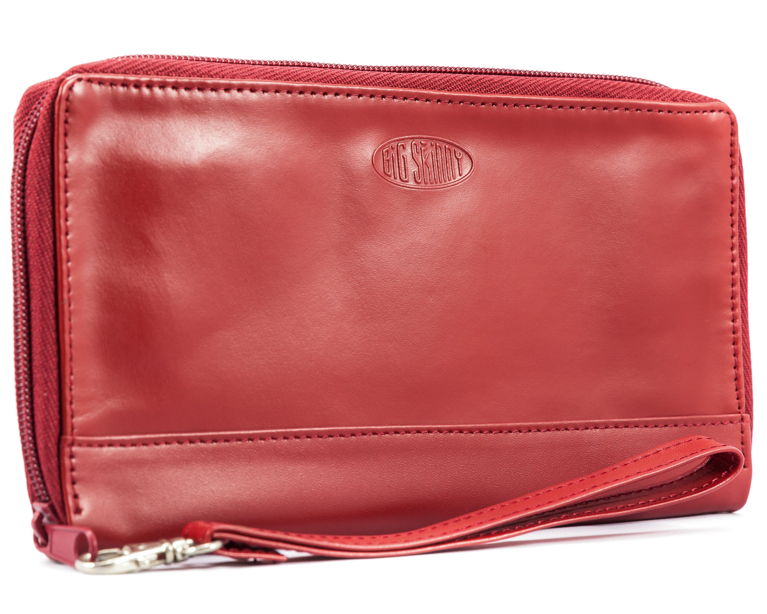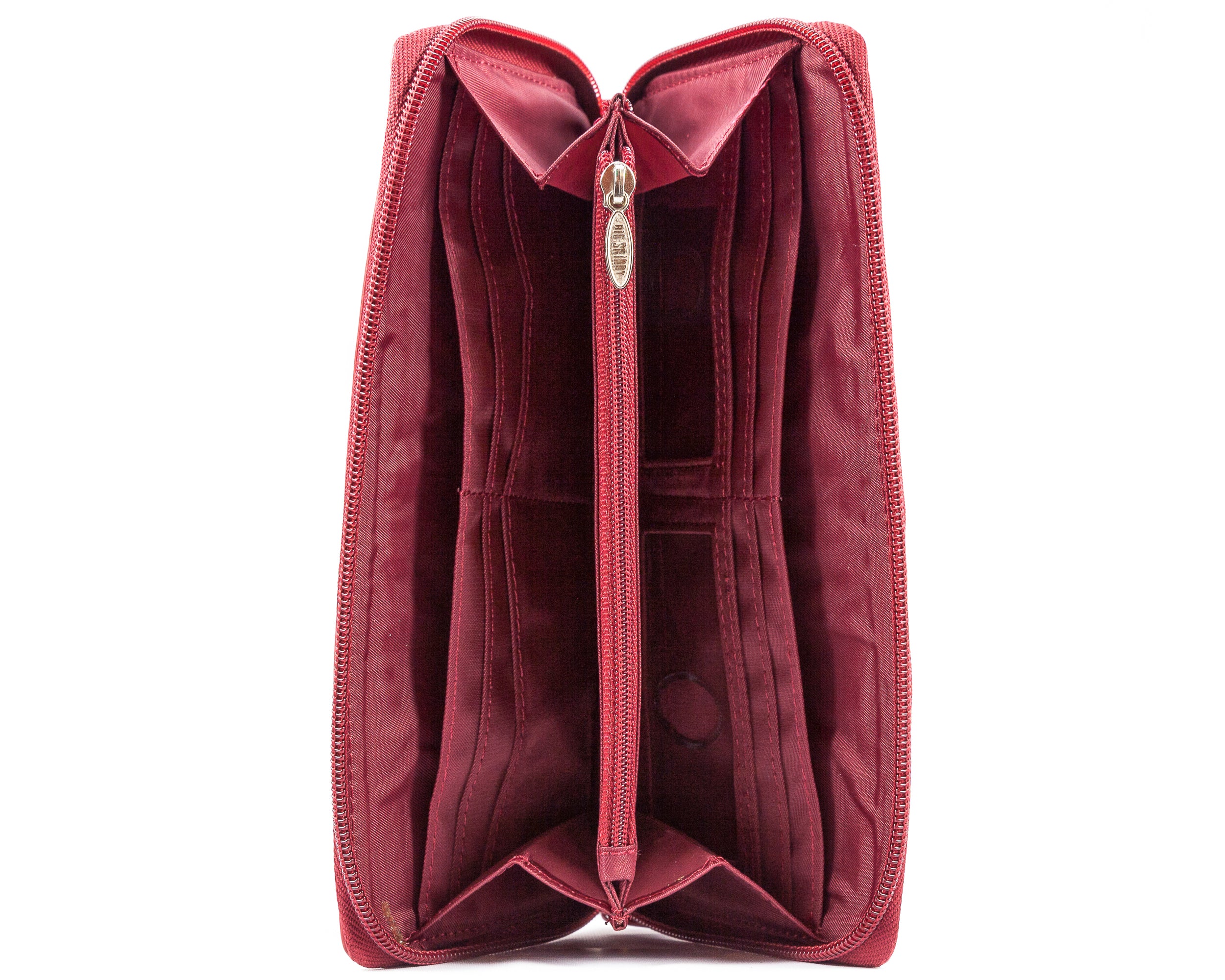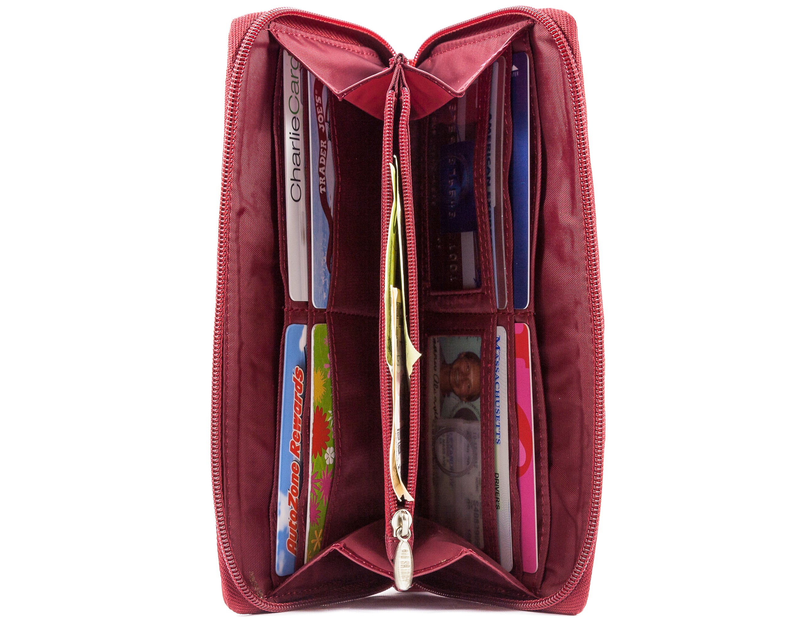 This sleek clutch/wallet has six credit card pockets that will hold up to 20 plastic cards, plus two clear window pockets for IDs and more cards. An interior zippered pocket holds your coins. The extra-long billfold area inside holds folding money and even over-sized foreign paper currency for your next jet-setting adventure.