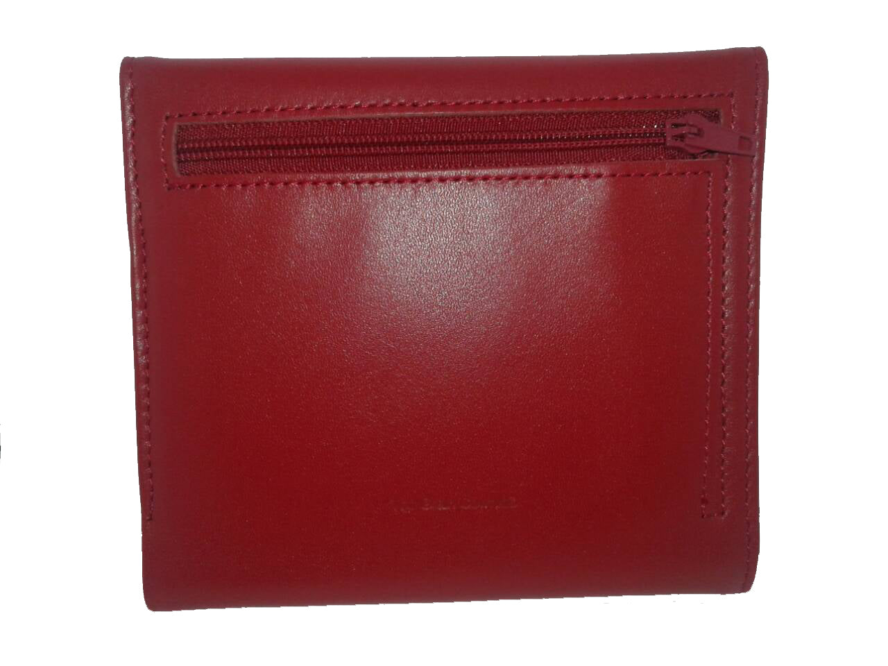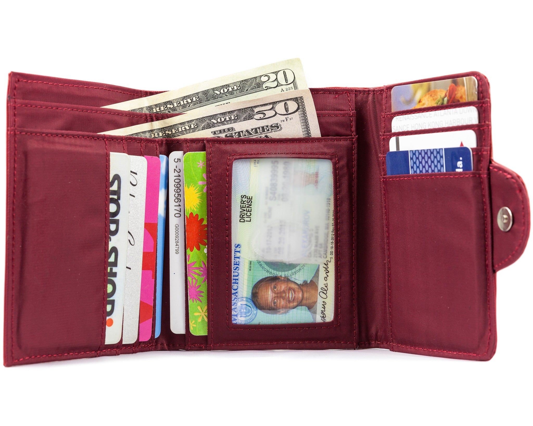 The zippered compartment on the back of this tri-fold wallet is roomy enough for a large handful of change, and the small magnetic closure keeps the whole wallet securely shut when it's being jostled around in your bag.