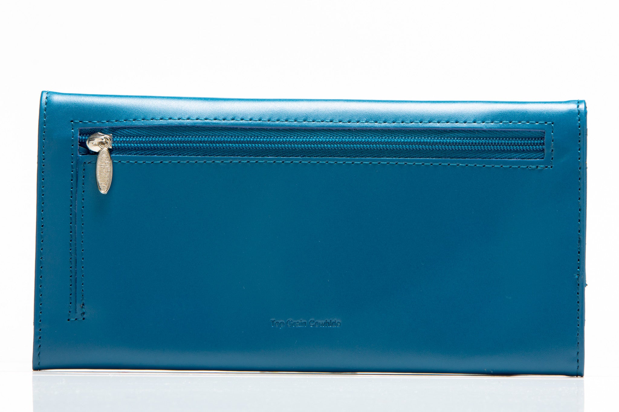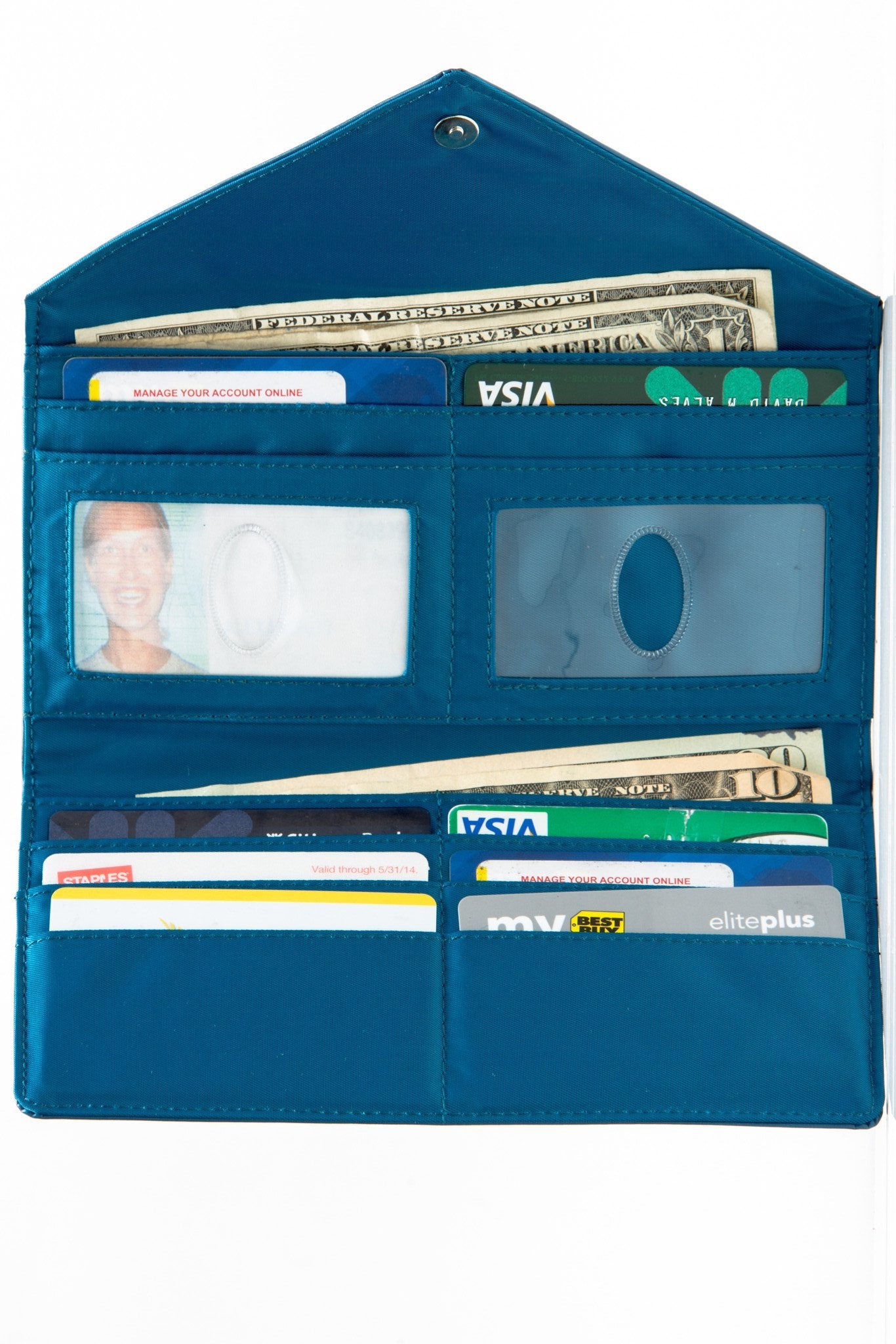 What women love are the surplus of non-slip pockets inside this stylish tri-fold wallet that's fashionable enough to do double duty as an evening clutch. A magnetic snap closure is on the front of the envelope-style wallet. Inside our tri-fold Slimvelope are two checkbook-sized billfolds, two clear plastic ID card pockets, and eight extra wide card pockets. Each holds up to 3-5 cards.