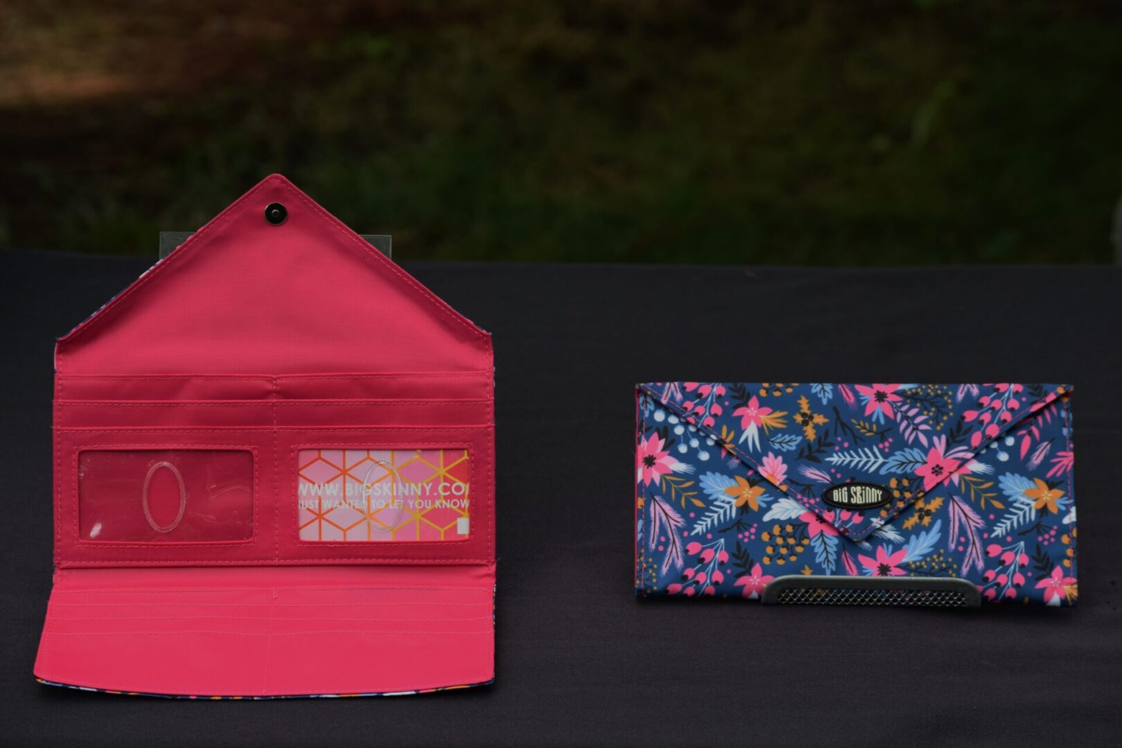 What women love are the surplus of non-slip pockets inside this stylish tri-fold wallet that's fashionable enough to do double duty as an evening clutch. A magnetic snap closure is on the front of the envelope-style wallet. Inside our tri-fold Slimvelope are two checkbook-sized billfolds, two clear plastic ID card pockets, and eight extra wide card pockets. Each holds up to 3-5 cards.