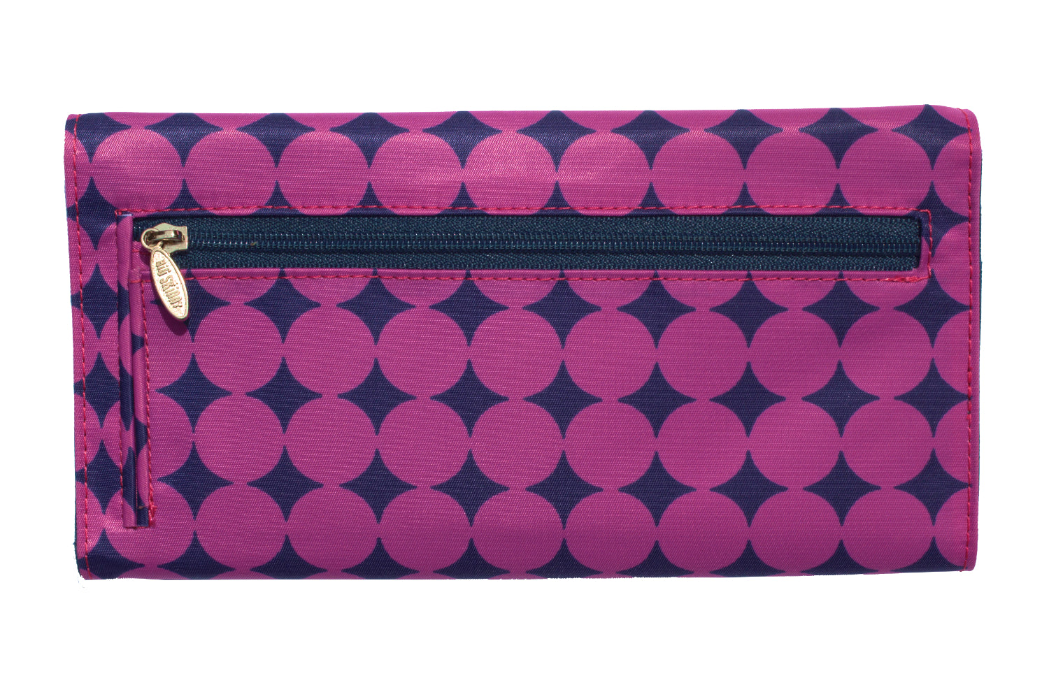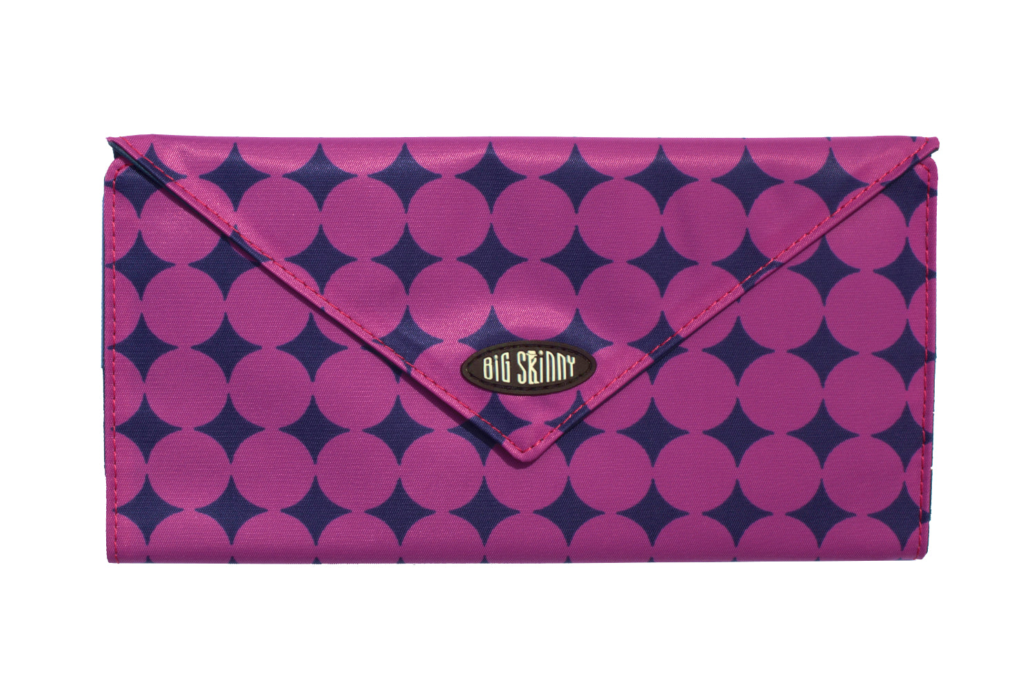 What women love are the surplus of non-slip pockets inside this stylish tri-fold wallet that's fashionable enough to do double duty as an evening clutch. A magnetic snap closure is on the front of the envelope-style wallet. Inside our tri-fold Slimvelope are two checkbook-sized billfolds, two clear plastic ID card pockets, and eight extra wide card pockets. Each holds up to 3-5 cards.