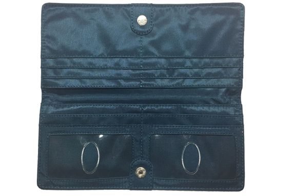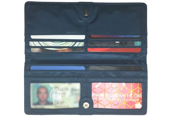This is the pencil skirt or pin-striped suit of our wallets…that impeccably tailored, polished look. This wallet will make people assume you read the WSJ while running your daily 10K before arriving at work at 6 am. Sleek, long, thin wallet yet roomy enough to accommodate up to 40 cards, and stretched out cash money plus coins. Our special “divide & conquer” design breaks up your cards into 4 discrete areas so they don’t all stagger on one long row leaving huge lumps. This means there will be very nice symmetry when your cards are in place and the wallet is shut so you’ll have an even, flattish plane rather than “staggered bulges” like all those other out-dated thick regular wallets. Two discrete billfold sized compartments enable separation between cash, receipts,or even differing currencies for travelers. Two ID pockets allow for double identities or that special photo. Both ID pockets feature our easy access thumb-activated hole for quick and easy card in and out. Snap securely shuts, and features an extra long coin compartment on the outside for easy access. Sleek enough for women’s jacket pockets, briefcases, laptop bags or switching to and from purses. Magnetic snap for an elegant opening and closing wallet experience.