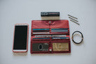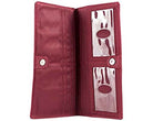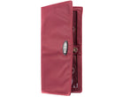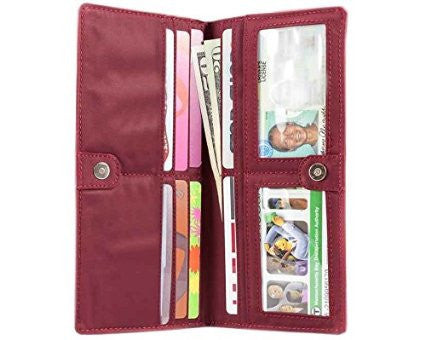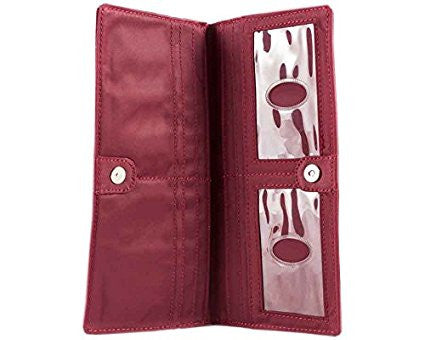 This is the pencil skirt or pin-striped suit of our wallets…that impeccably tailored, polished look. This wallet will make people assume you read the WSJ while running your daily 10K before arriving at work at 6 am. Sleek, long, thin wallet yet roomy enough to accommodate up to 40 cards, and stretched out cash money plus coins. Our special “divide & conquer” design breaks up your cards into 4 discrete areas so they don’t all stagger on one long row leaving huge lumps. This means there will be very nice symmetry when your cards are in place and the wallet is shut so you’ll have an even, flattish plane rather than “staggered bulges” like all those other out-dated thick regular wallets. Two discrete billfold sized compartments enable separation between cash, receipts,or even differing currencies for travelers. Two ID pockets allow for double identities or that special photo. Both ID pockets feature our easy access thumb-activated hole for quick and easy card in and out. Snap securely shuts, and features an extra long coin compartment on the outside for easy access. Sleek enough for women’s jacket pockets, briefcases, laptop bags or switching to and from purses. Magnetic snap for an elegant opening and closing wallet experience.
