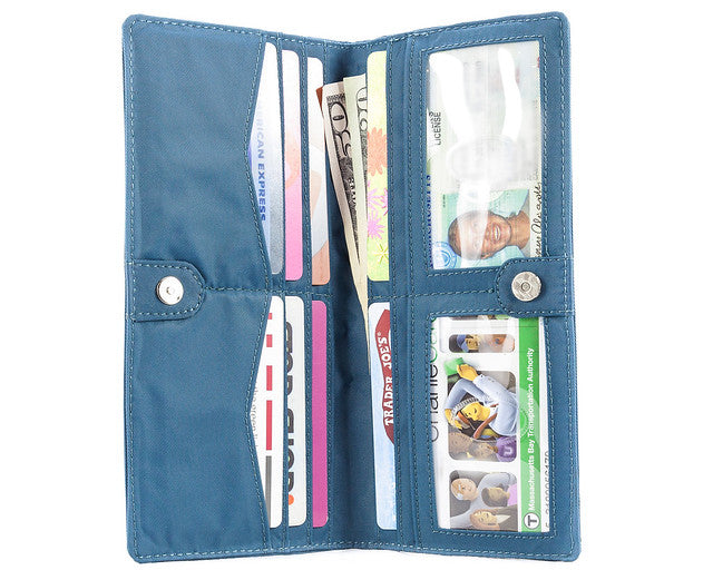 This is the pencil skirt or pin-striped suit of our wallets…that impeccably tailored, polished look. This wallet will make people assume you read the WSJ while running your daily 10K before arriving at work at 6 am. Sleek, long, thin wallet yet roomy enough to accommodate up to 40 cards, and stretched out cash money plus coins. Our special “divide & conquer” design breaks up your cards into 4 discrete areas so they don’t all stagger on one long row leaving huge lumps. This means there will be very nice symmetry when your cards are in place and the wallet is shut so you’ll have an even, flattish plane rather than “staggered bulges” like all those other out-dated thick regular wallets. Two discrete billfold sized compartments enable separation between cash, receipts,or even differing currencies for travelers. Two ID pockets allow for double identities or that special photo. Both ID pockets feature our easy access thumb-activated hole for quick and easy card in and out. Snap securely shuts, and features an extra long coin compartment on the outside for easy access. Sleek enough for women’s jacket pockets, briefcases, laptop bags or switching to and from purses. Magnetic snap for an elegant opening and closing wallet experience.