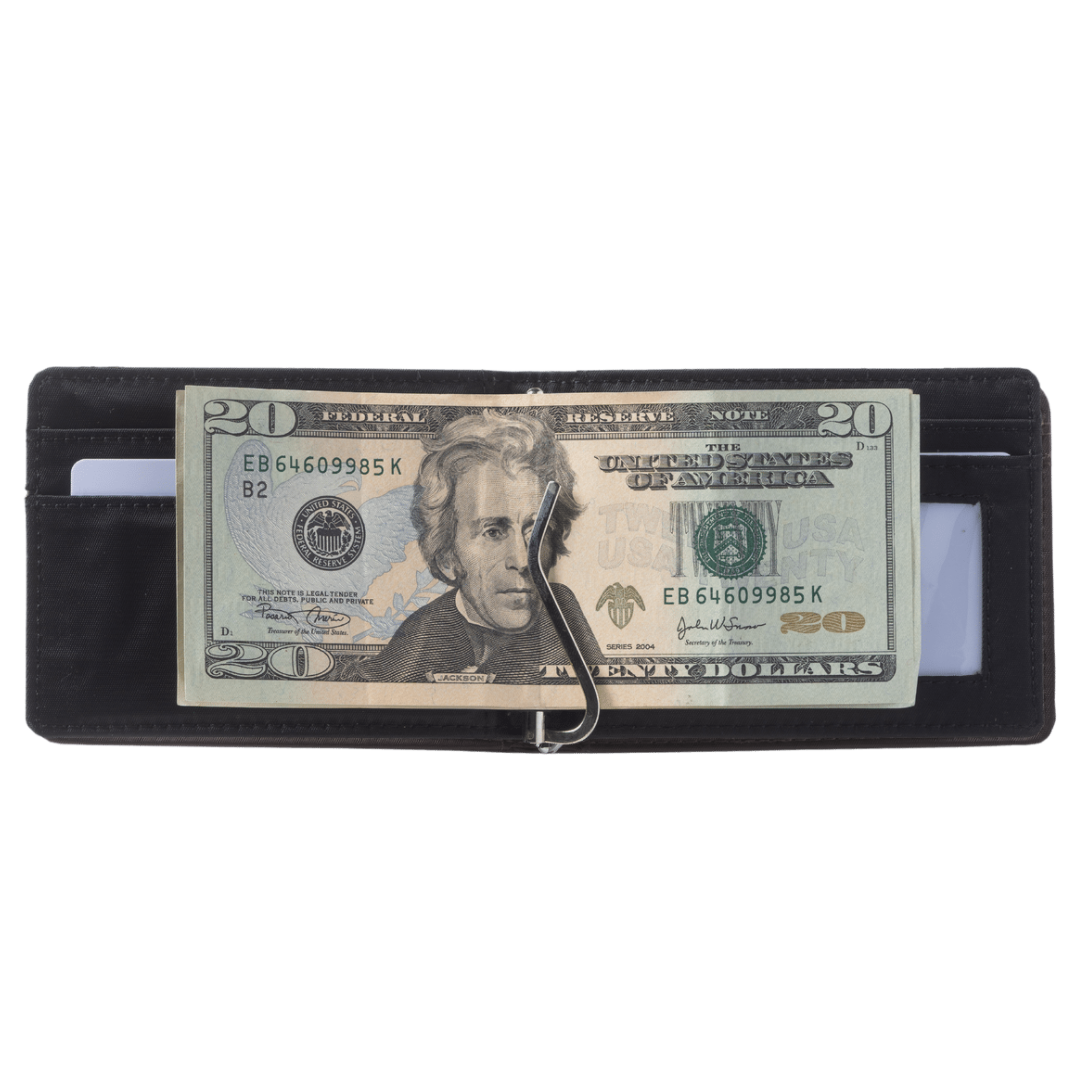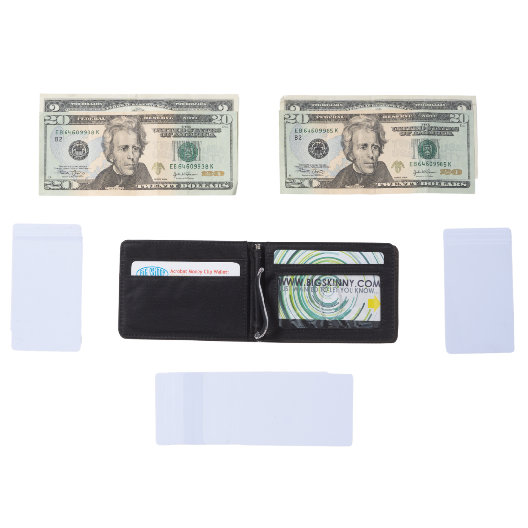 Suspend your cash. Yup, we got rid of the billfold area in our efforts to maintain thinness so now your cash is clipped inside the wallet area. Card slots for plastic and you have one of the smallest imprint-sized wallets in the world--- barely the outline of the cash... Holds 20 plastic cards and you can fit this thin compact wallet in any small pocket you desire--- shirt, front or back pants pocket, suit pockets, or under your hat...1/4" thin on the spring end and 1/8" on the thinner outside side when empty.