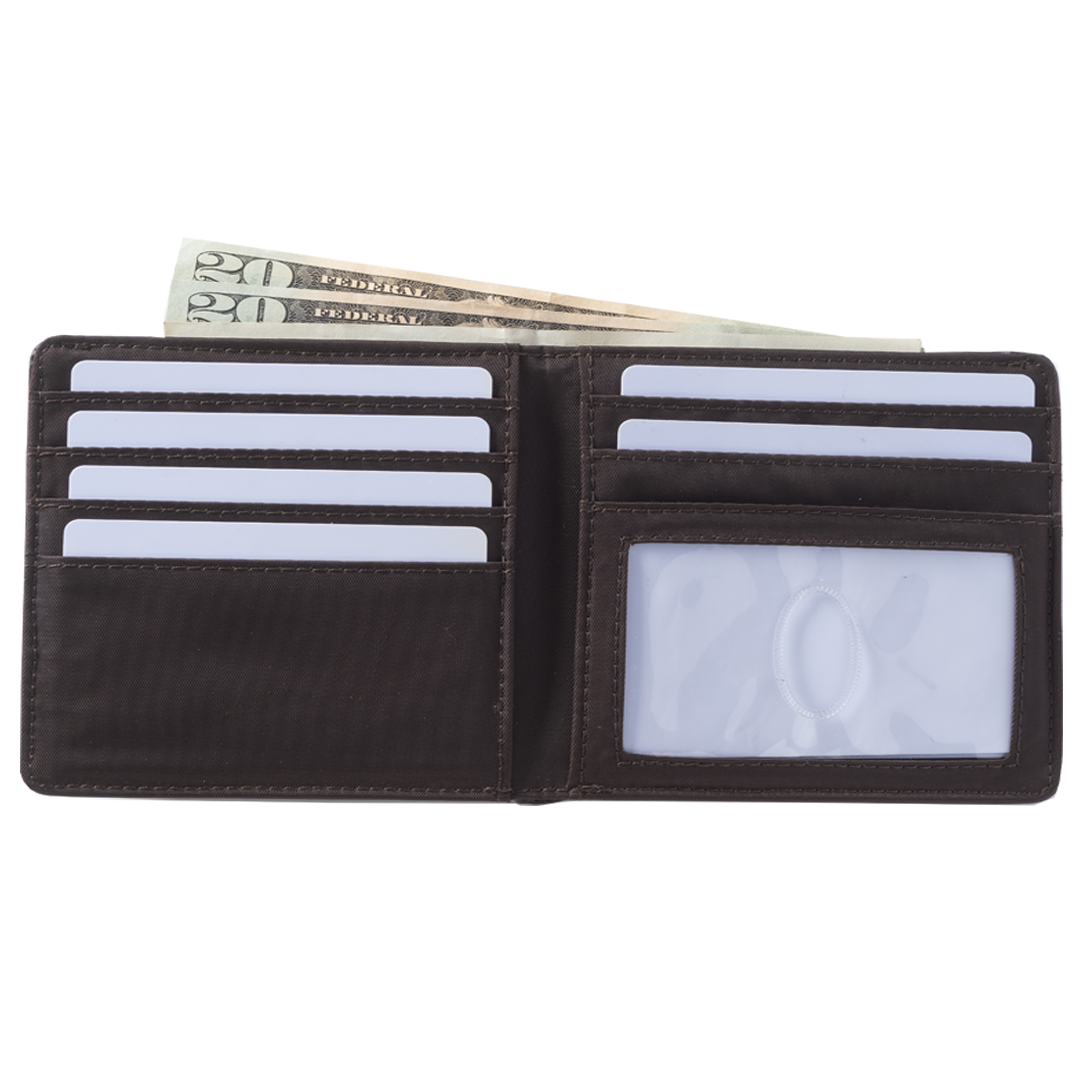 The Leather Hybrid World Bi-fold Wallet has the shape of a bi-fold wallet. It measures almost a perfect 4 inches square, it holds up to 30 standard plastic cards, plus a ton of cash. The wallet is made of super-thin top-grain leather on the outside and ultra-thin nylon on the inside for comfort, style, and durability.