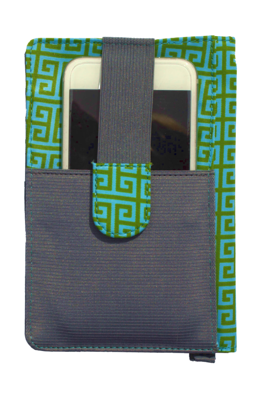 - Cell phone pocket on reverse holds phone in securely with elasticized strap
