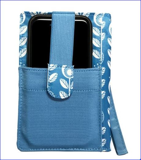 - Cell phone pocket on reverse holds phone in securely with elasticized strap
