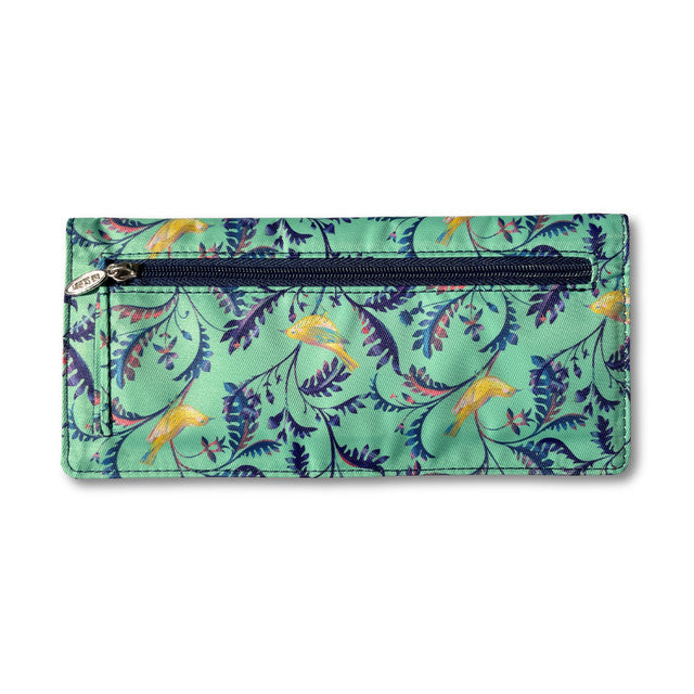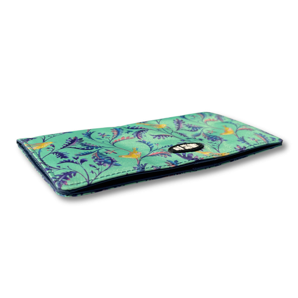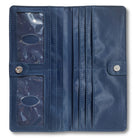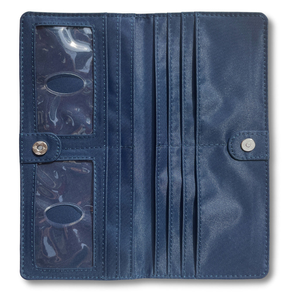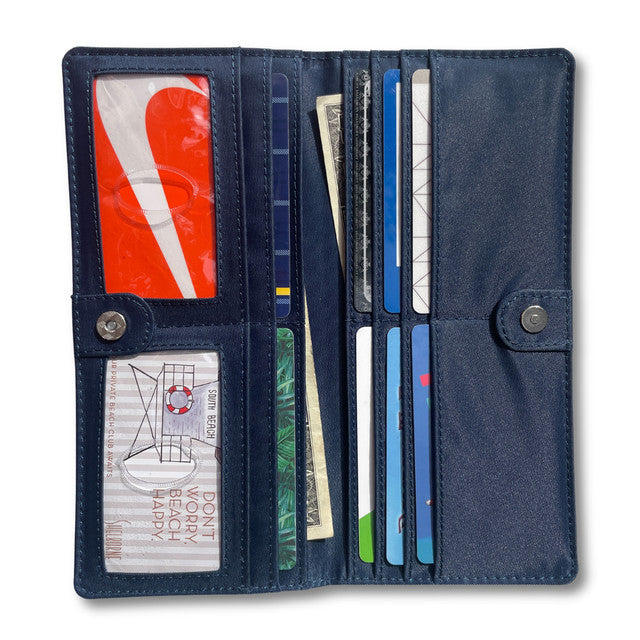 This is the pencil skirt or pin-striped suit of our wallets…that impeccably tailored, polished look. This wallet will make people assume you read the WSJ while running your daily 10K before arriving at work at 6 am. Sleek, long, thin wallet yet roomy enough to accommodate up to 40 cards, and stretched out cash money plus coins. Our special “divide & conquer” design breaks up your cards into 4 discrete areas so they don’t all stagger on one long row leaving huge lumps. This means there will be very nice symmetry when your cards are in place and the wallet is shut so you’ll have an even, flattish plane rather than “staggered bulges” like all those other out-dated thick regular wallets. Two discrete billfold sized compartments enable separation between cash, receipts,or even differing currencies for travelers. Two ID pockets allow for double identities or that special photo. Both ID pockets feature our easy access thumb-activated hole for quick and easy card in and out. Snap securely shuts, and features an extra long coin compartment on the outside for easy access. Sleek enough for women’s jacket pockets, briefcases, laptop bags or switching to and from purses. Magnetic snap for an elegant opening and closing wallet experience.