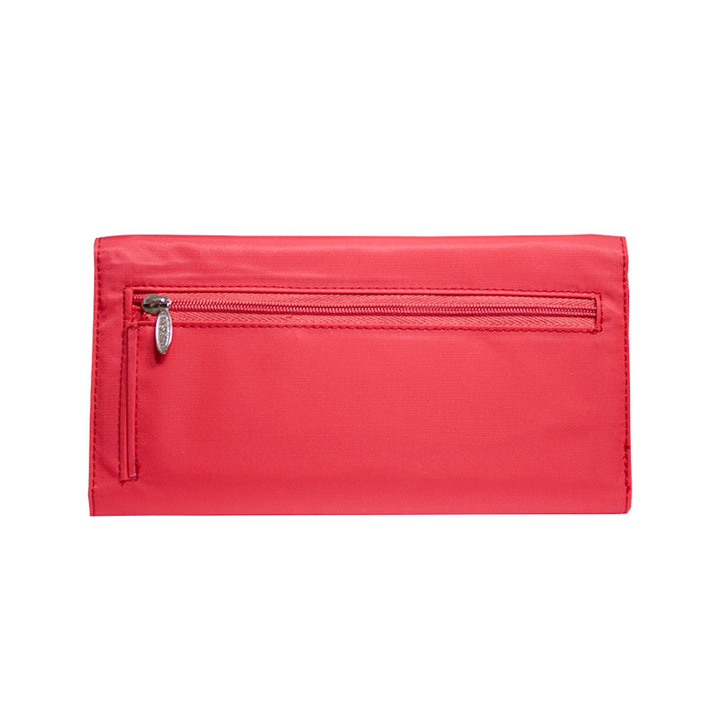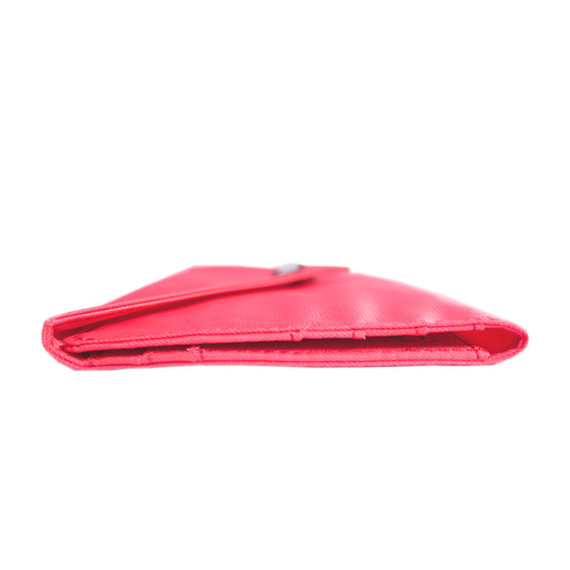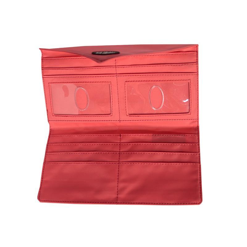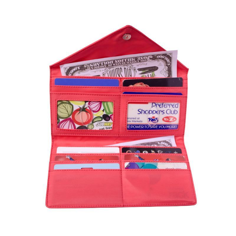 What women love are the surplus of non-slip pockets inside this stylish tri-fold wallet that's fashionable enough to do double duty as an evening clutch. A magnetic snap closure is on the front of the envelope-style wallet. Inside our tri-fold Slimvelope are two checkbook-sized billfolds, two clear plastic ID card pockets, and eight extra wide card pockets. Each holds up to 3-5 cards.