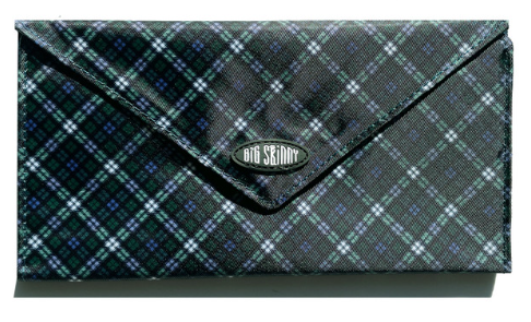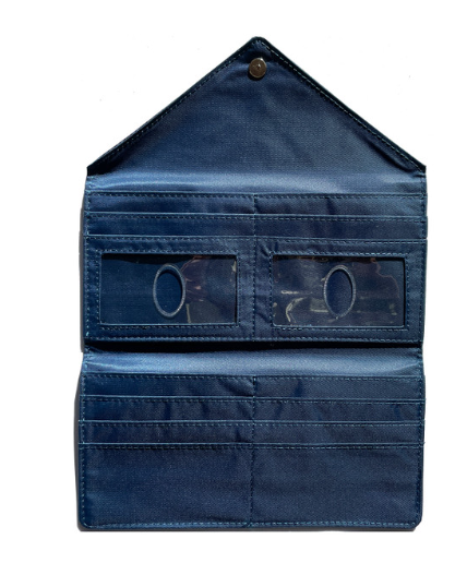 What women love are the surplus of non-slip pockets inside this stylish tri-fold wallet that's fashionable enough to do double duty as an evening clutch. A magnetic snap closure is on the front of the envelope-style wallet. Inside our tri-fold Slimvelope are two checkbook-sized billfolds, two clear plastic ID card pockets, and eight extra wide card pockets. Each holds up to 3-5 cards.
