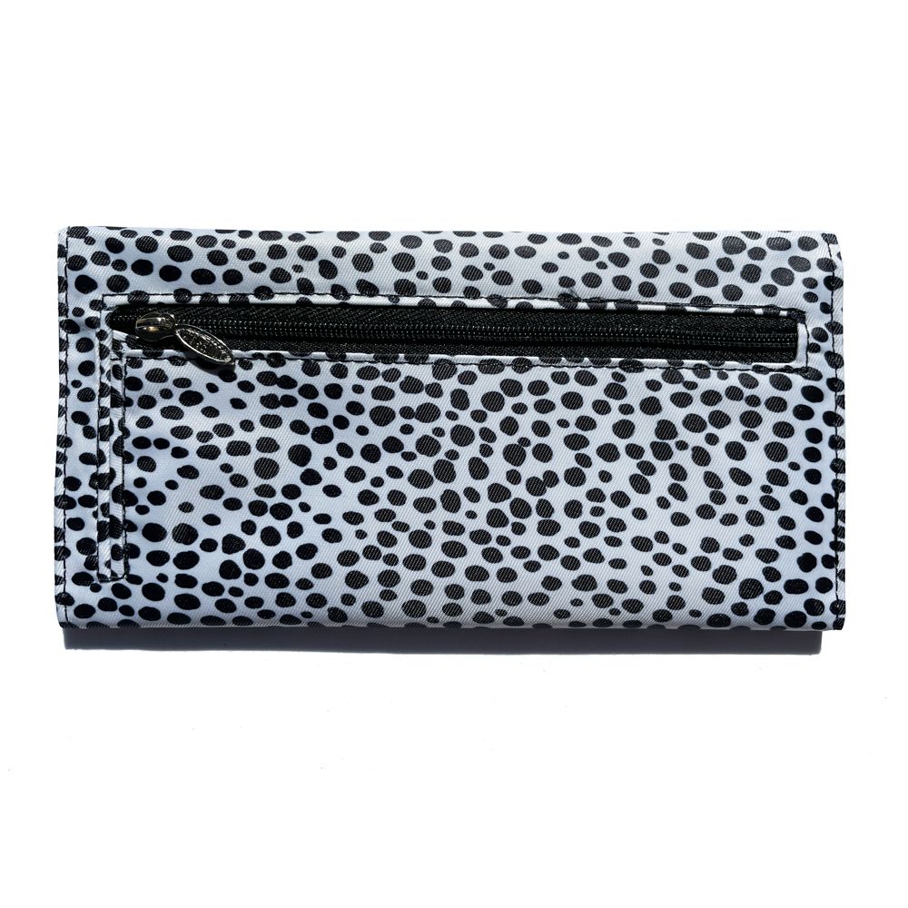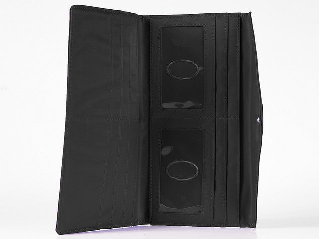 What women love are the surplus of non-slip pockets inside this stylish tri-fold wallet that's fashionable enough to do double duty as an evening clutch. A magnetic snap closure is on the front of the envelope-style wallet. Inside our tri-fold Slimvelope are two checkbook-sized billfolds, two clear plastic ID card pockets, and eight extra wide card pockets. Each holds up to 3-5 cards.