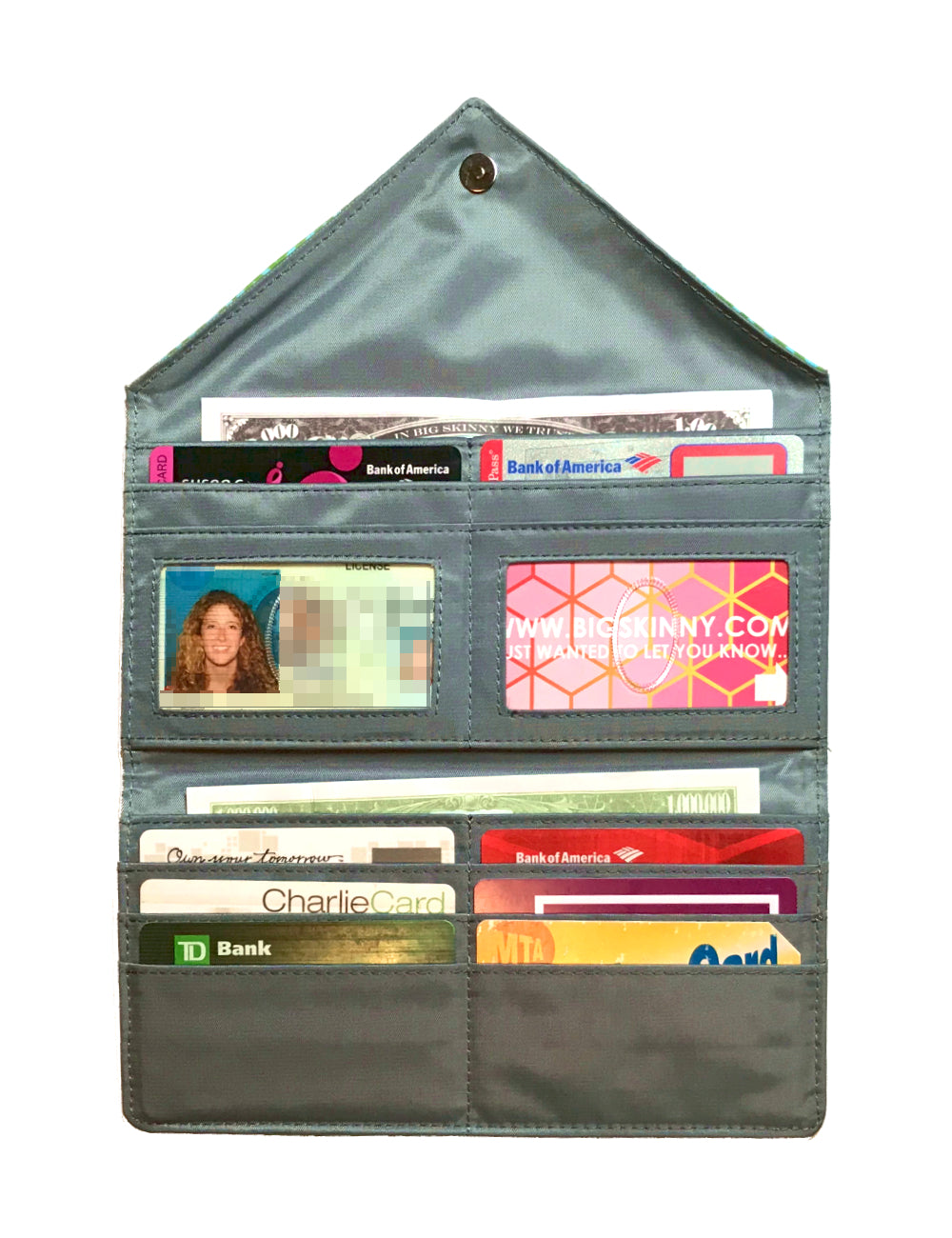 What women love are the surplus of non-slip pockets inside this stylish tri-fold wallet that's fashionable enough to do double duty as an evening clutch. A magnetic snap closure is on the front of the envelope-style wallet. Inside our tri-fold Slimvelope are two checkbook-sized billfolds, two clear plastic ID card pockets, and eight extra wide card pockets. Each holds up to 3-5 cards.