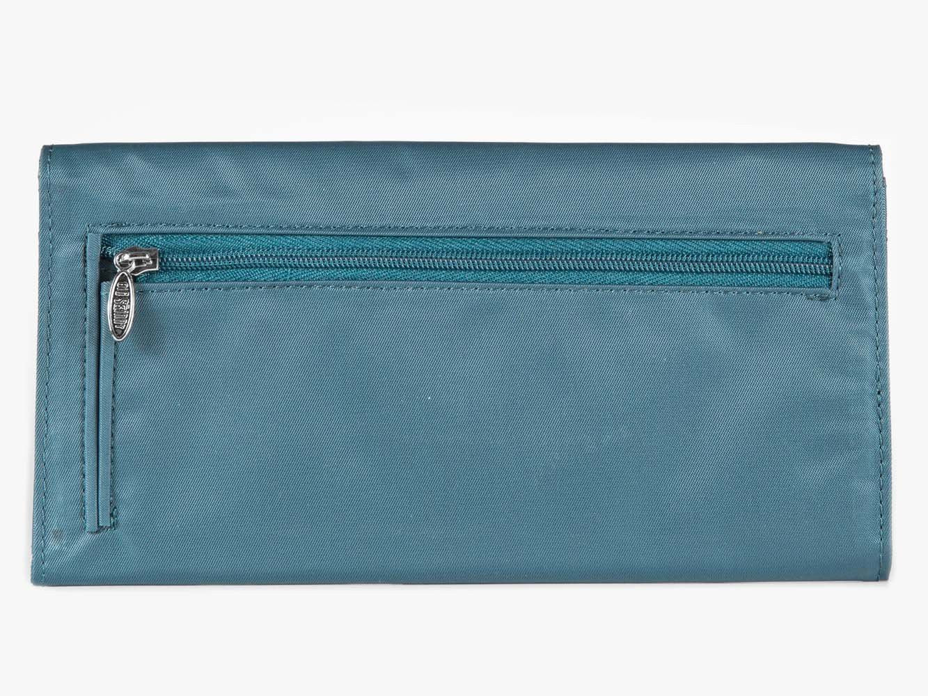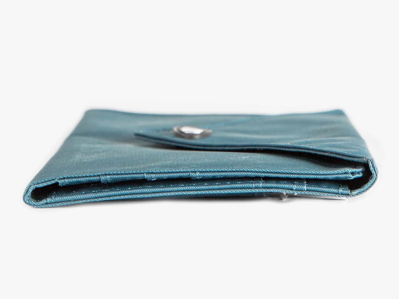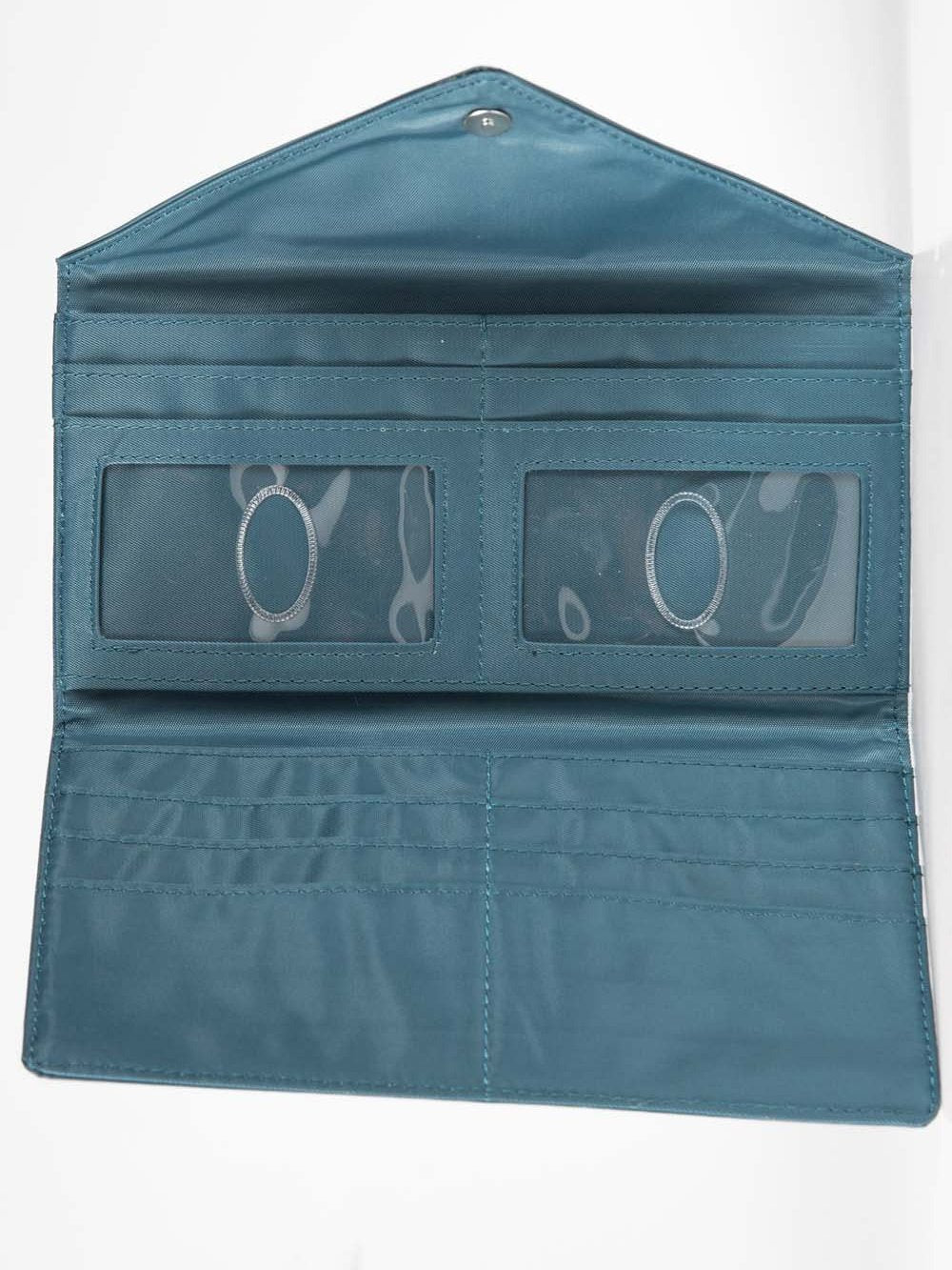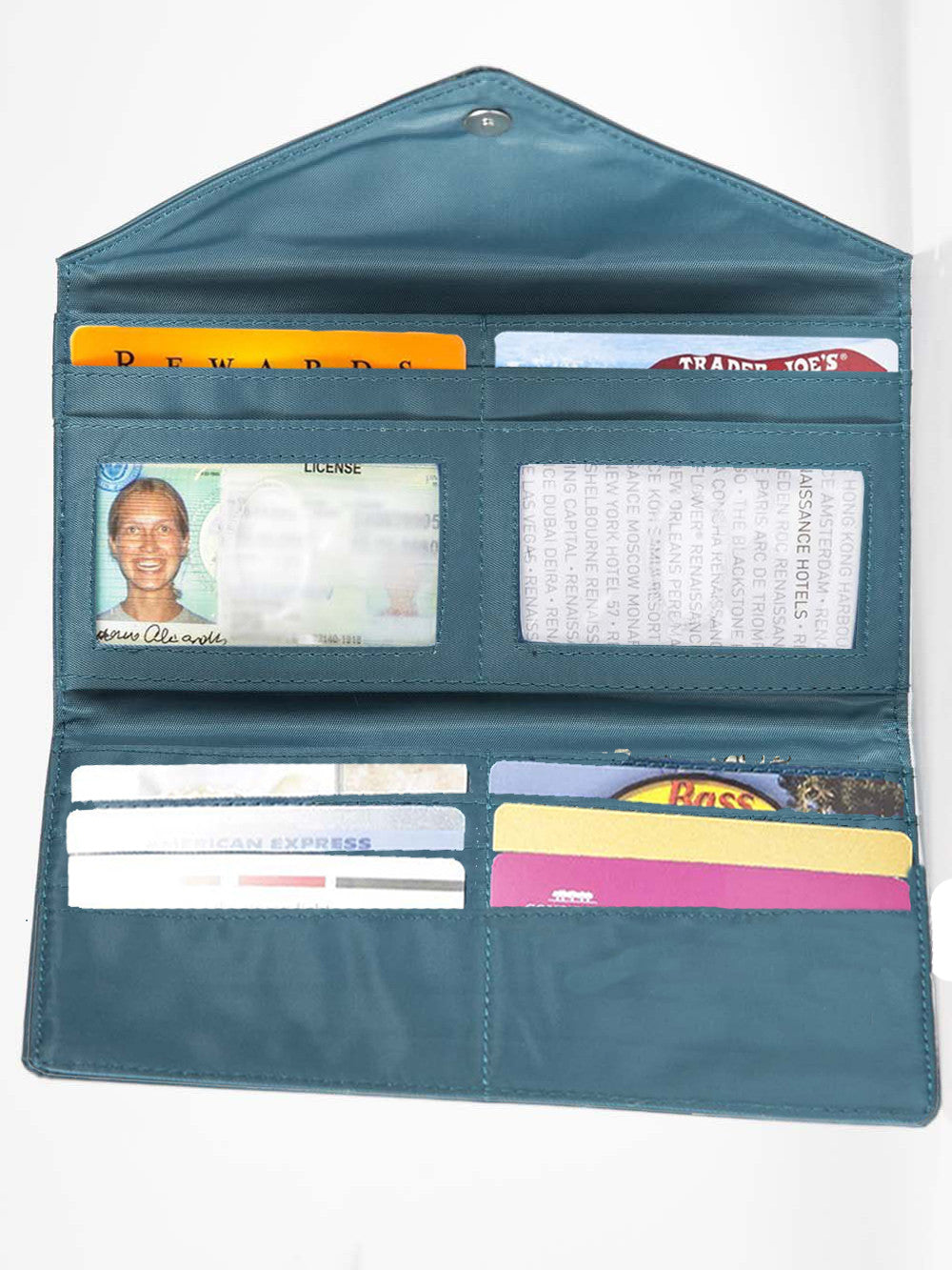 What women love are the surplus of non-slip pockets inside this stylish tri-fold wallet that's fashionable enough to do double duty as an evening clutch. A magnetic snap closure is on the front of the envelope-style wallet. Inside our tri-fold Slimvelope are two checkbook-sized billfolds, two clear plastic ID card pockets, and eight extra wide card pockets. Each holds up to 3-5 cards.