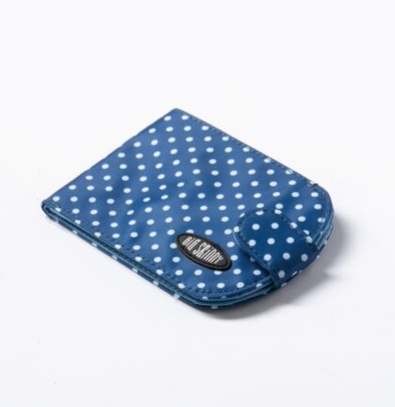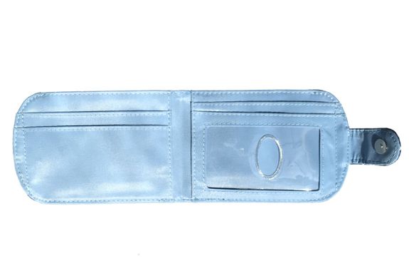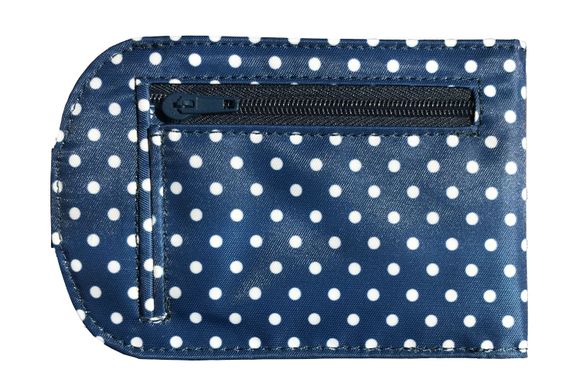 This thin wallet has a nifty coin pocket on the outside to feed the meters. The snap enclosure and rounded ends were added to make it easy to tuck into a purse or front or back pocket. You can carry it in the palm of your hand. It will hold up to 15 plastic credit and ID cards, plus folded money.
