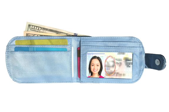 The Taxicat has one exterior zippered coin pocket on the outside. On the inside are one extra-wide interior clear ID pocket, one billfold area and two extra-wide, deep credit card storage pockets. We make our inside pockets wide, because we know how it feels to get your fingers stuck trying to pull out your ID or a credit card. We add a non-slip coating inside each pocket to keep those important cards from spilling out.