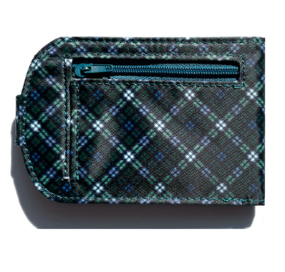 This thin wallet has a nifty coin pocket on the outside to feed the meters. The snap enclosure and rounded ends were added to make it easy to tuck into a purse or front or back pocket. You can carry it in the palm of your hand. It will hold up to 15 plastic credit and ID cards, plus folded money.