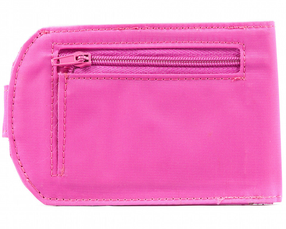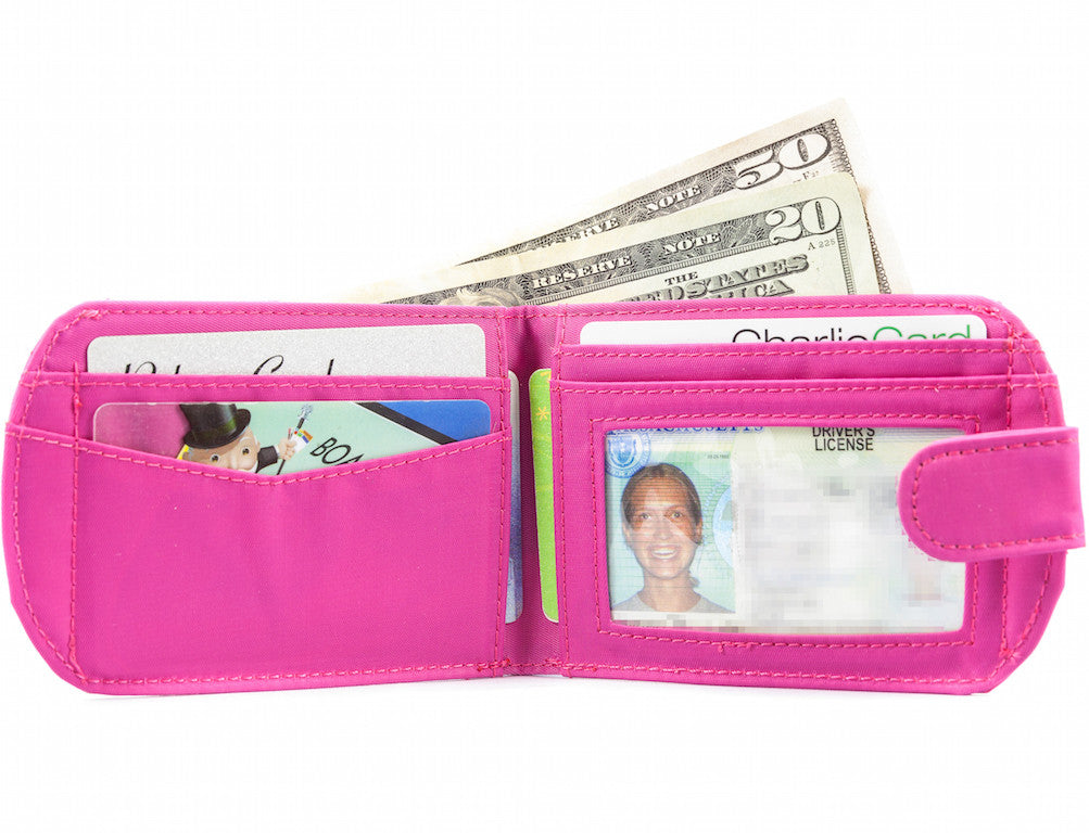 The Taxicat has one exterior zippered coin pocket on the outside. On the inside are one extra-wide interior clear ID pocket, one billfold area and two extra-wide, deep credit card storage pockets. We make our inside pockets wide, because we know how it feels to get your fingers stuck trying to pull out your ID or a credit card. We add a non-slip coating inside each pocket to keep those important cards from spilling out.