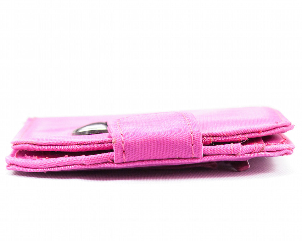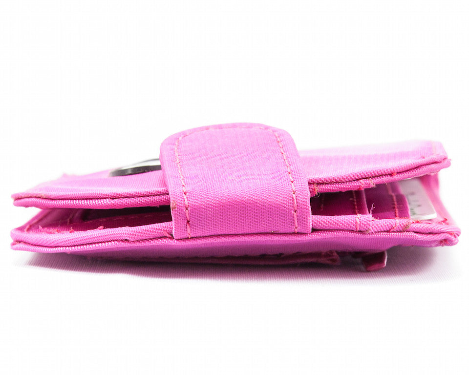 This thin wallet has a nifty coin pocket on the outside to feed the meters. The snap enclosure and rounded ends were added to make it easy to tuck into a purse or front or back pocket. You can carry it in the palm of your hand. It will hold up to 15 plastic credit and ID cards, plus folded money.