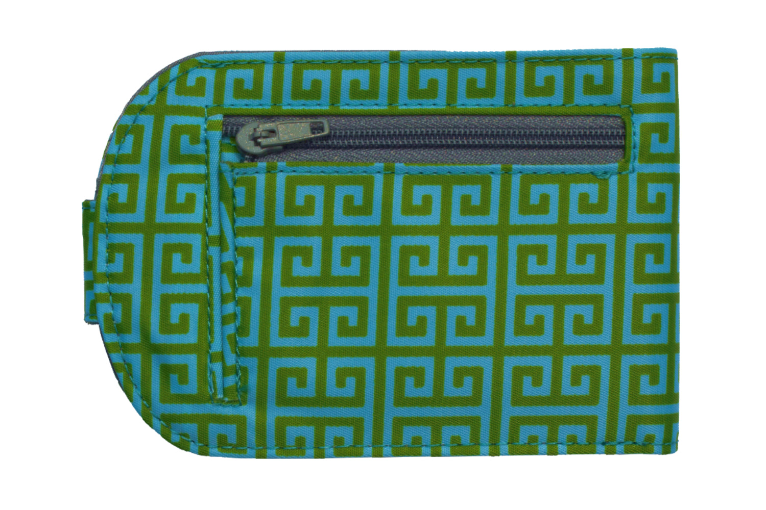 This thin wallet has a nifty coin pocket on the outside to feed the meters. The snap enclosure and rounded ends were added to make it easy to tuck into a purse or front or back pocket. You can carry it in the palm of your hand. It will hold up to 15 plastic credit and ID cards, plus folded money.