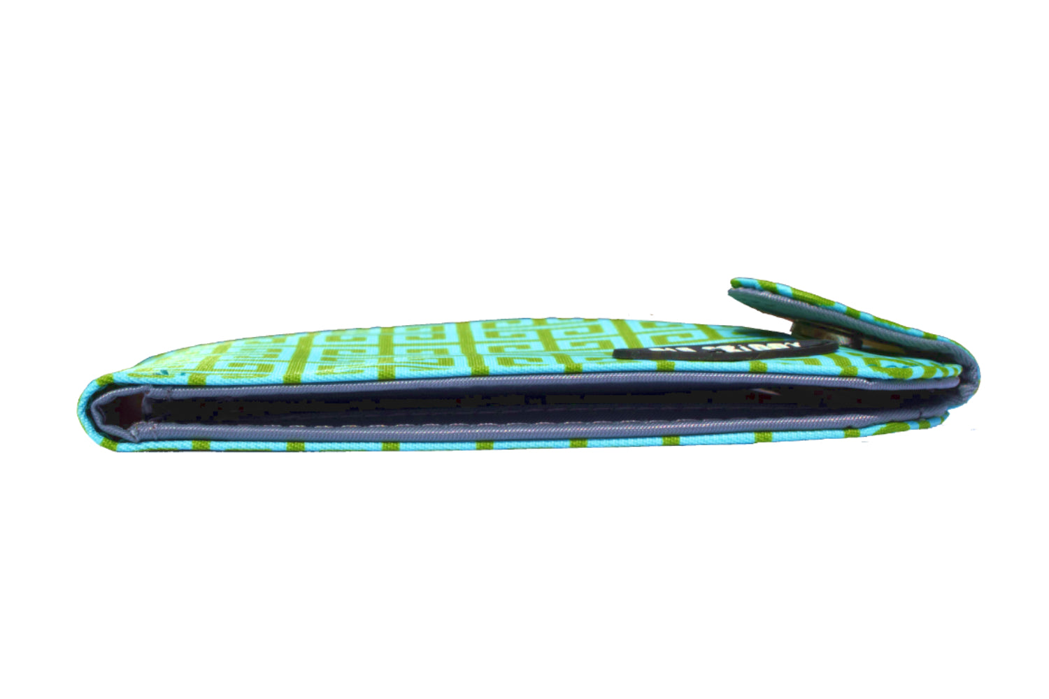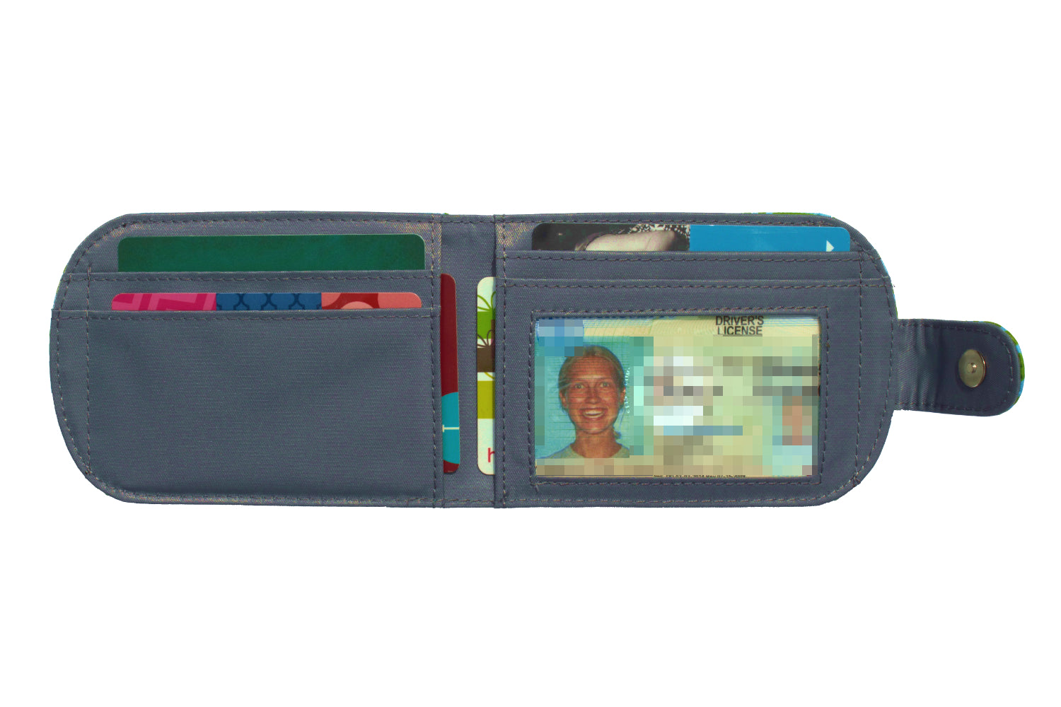 The Taxicat has one exterior zippered coin pocket on the outside. On the inside are one extra-wide interior clear ID pocket, one billfold area and two extra-wide, deep credit card storage pockets. We make our inside pockets wide, because we know how it feels to get your fingers stuck trying to pull out your ID or a credit card. We add a non-slip coating inside each pocket to keep those important cards from spilling out.