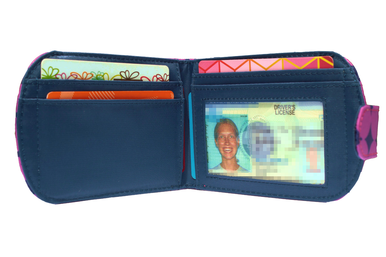 The Taxicat has one exterior zippered coin pocket on the outside. On the inside are one extra-wide interior clear ID pocket, one billfold area and two extra-wide, deep credit card storage pockets. We make our inside pockets wide, because we know how it feels to get your fingers stuck trying to pull out your ID or a credit card. We add a non-slip coating inside each pocket to keep those important cards from spilling out.