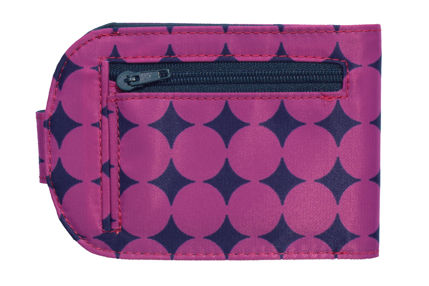 This thin wallet has a nifty coin pocket on the outside to feed the meters. The snap enclosure and rounded ends were added to make it easy to tuck into a purse or front or back pocket. You can carry it in the palm of your hand. It will hold up to 15 plastic credit and ID cards, plus folded money.