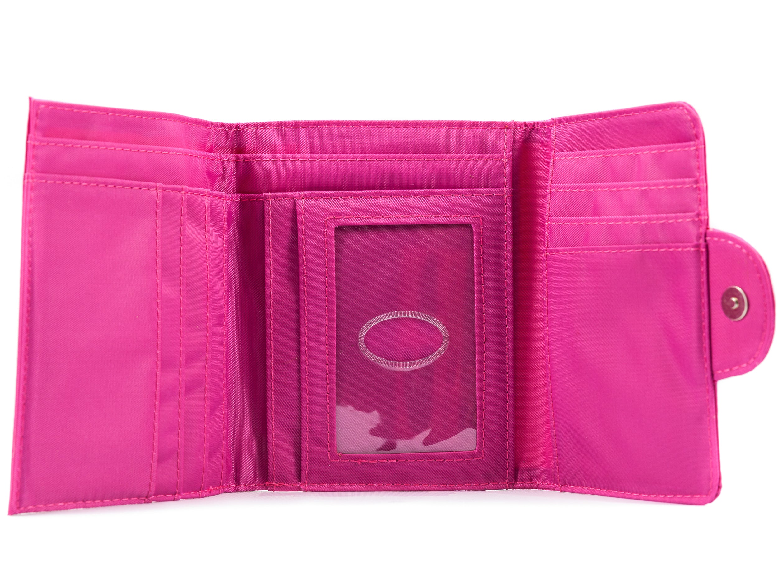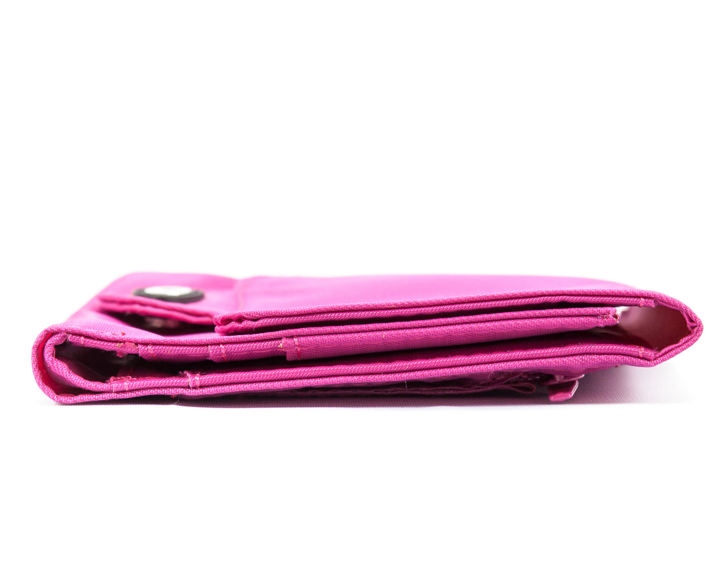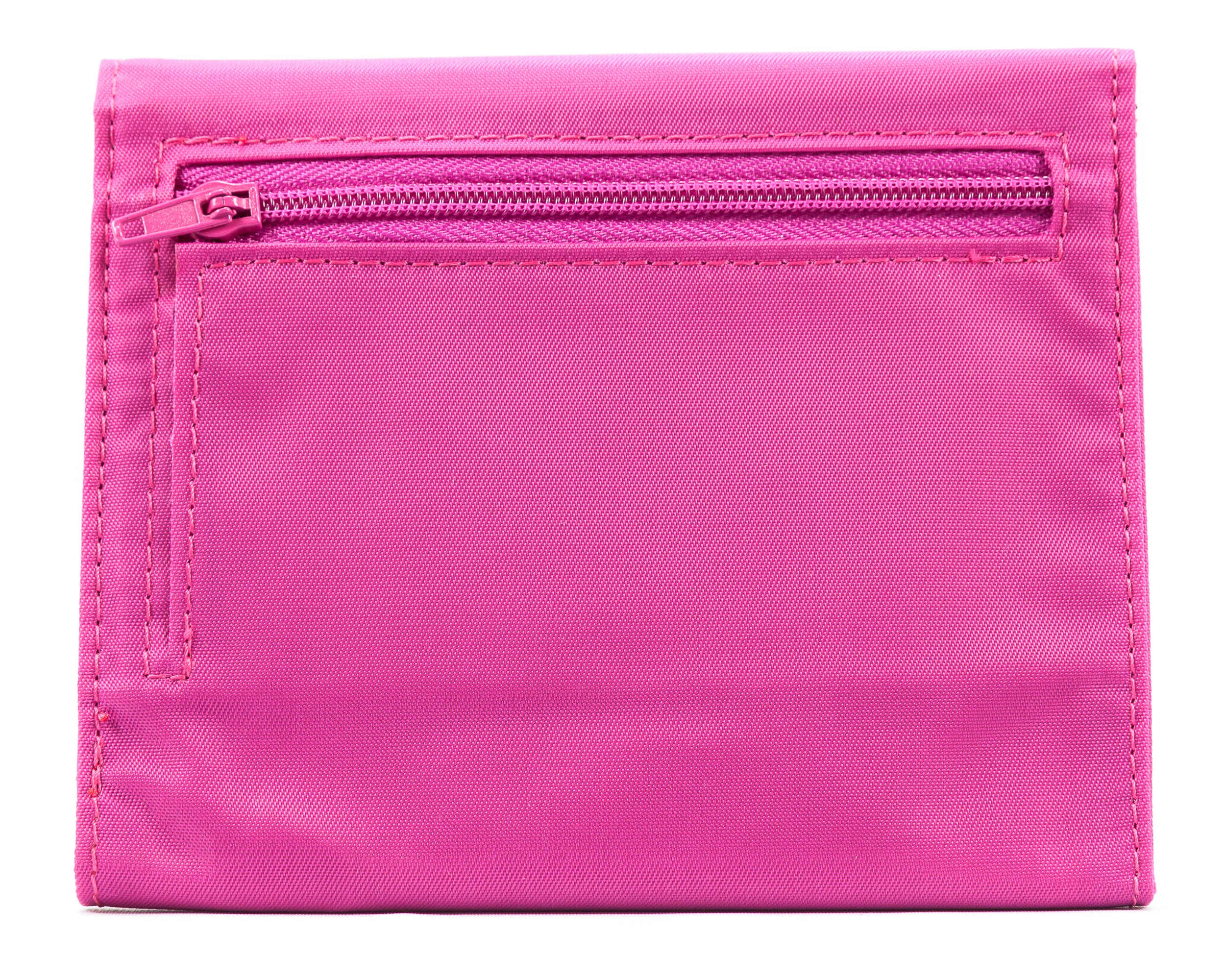 The zippered compartment on the back of this tri-fold wallet is roomy enough for a large handful of change, and the small magnetic closure keeps the whole wallet securely shut when it's being jostled around in your bag.