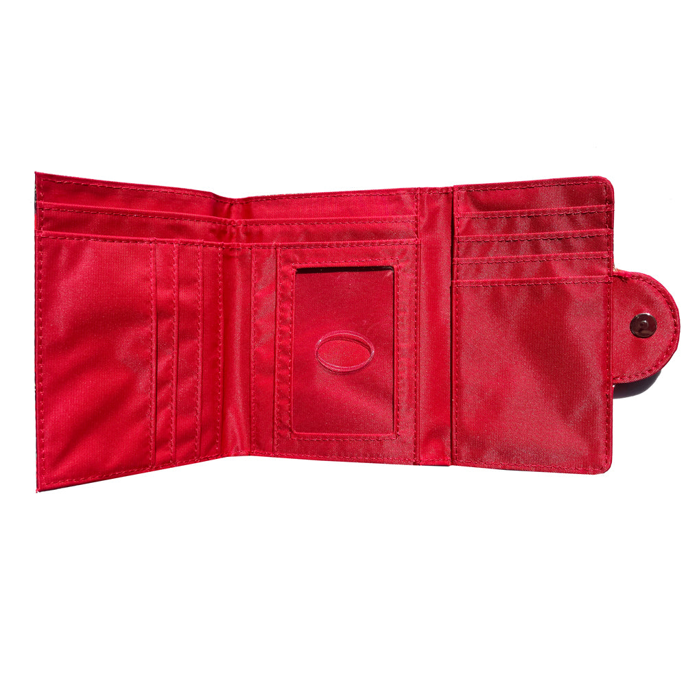 The zippered compartment on the back of this tri-fold wallet is roomy enough for a large handful of change, and the small magnetic closure keeps the whole wallet securely shut when it's being jostled around in your bag.